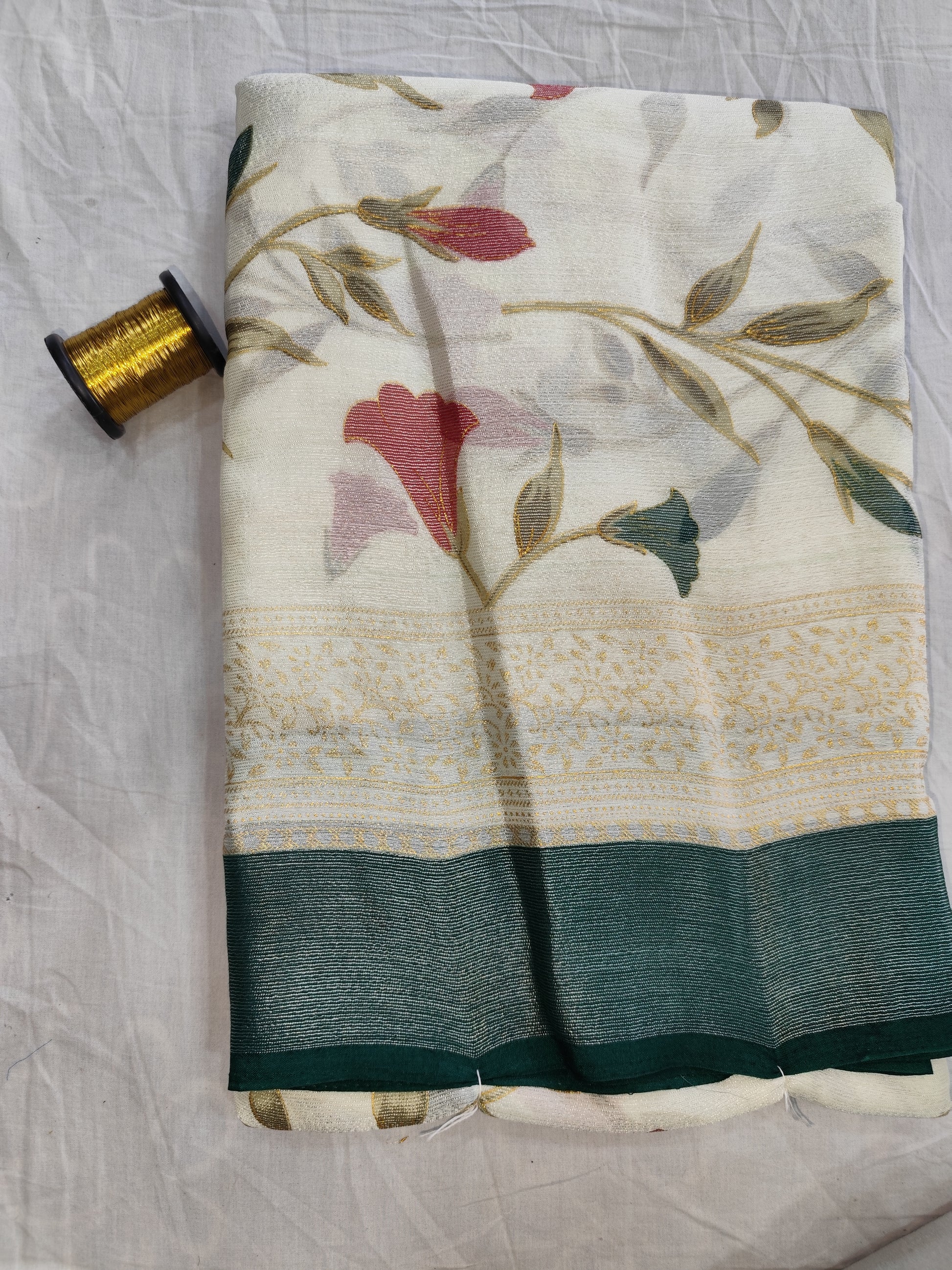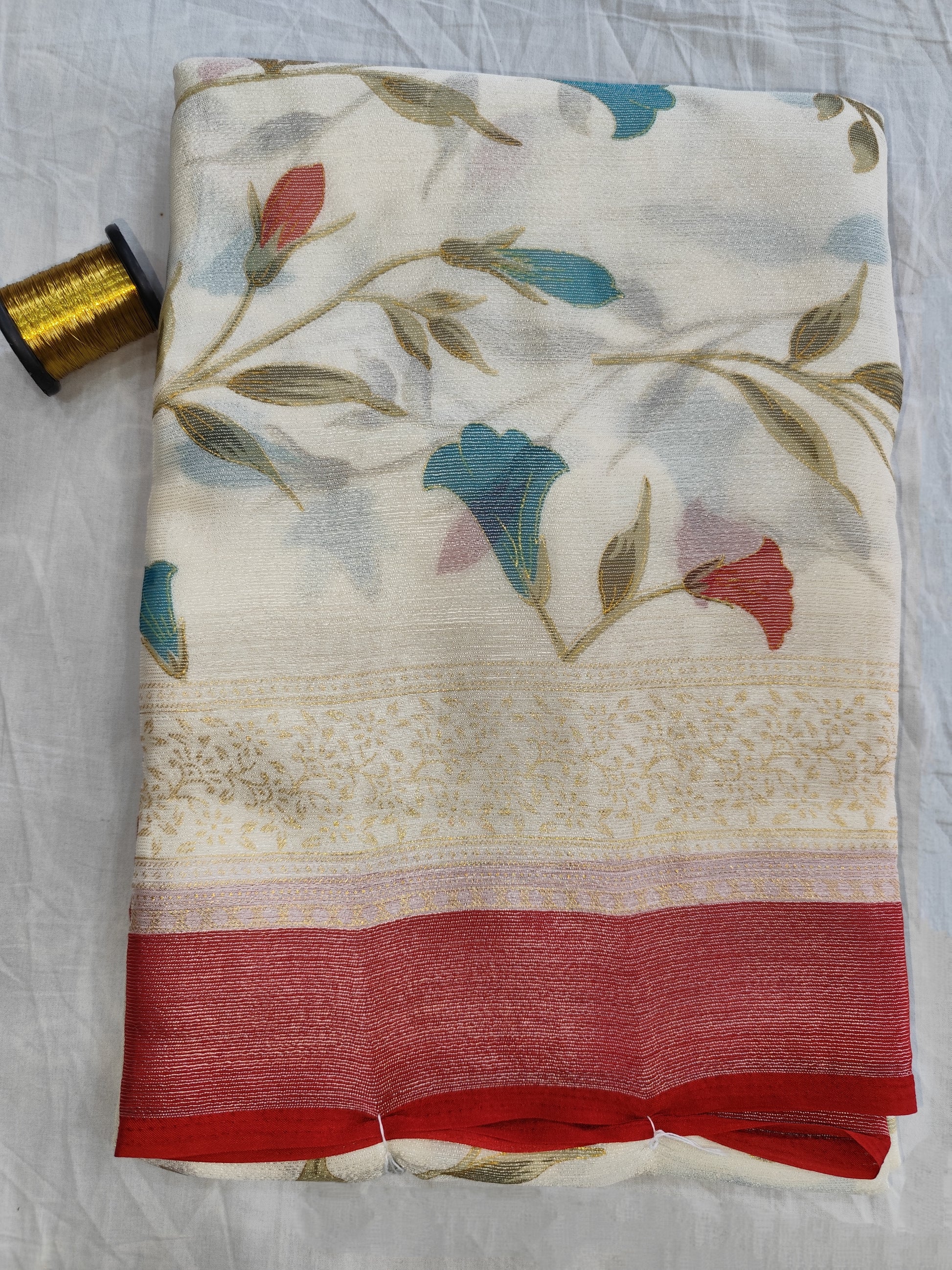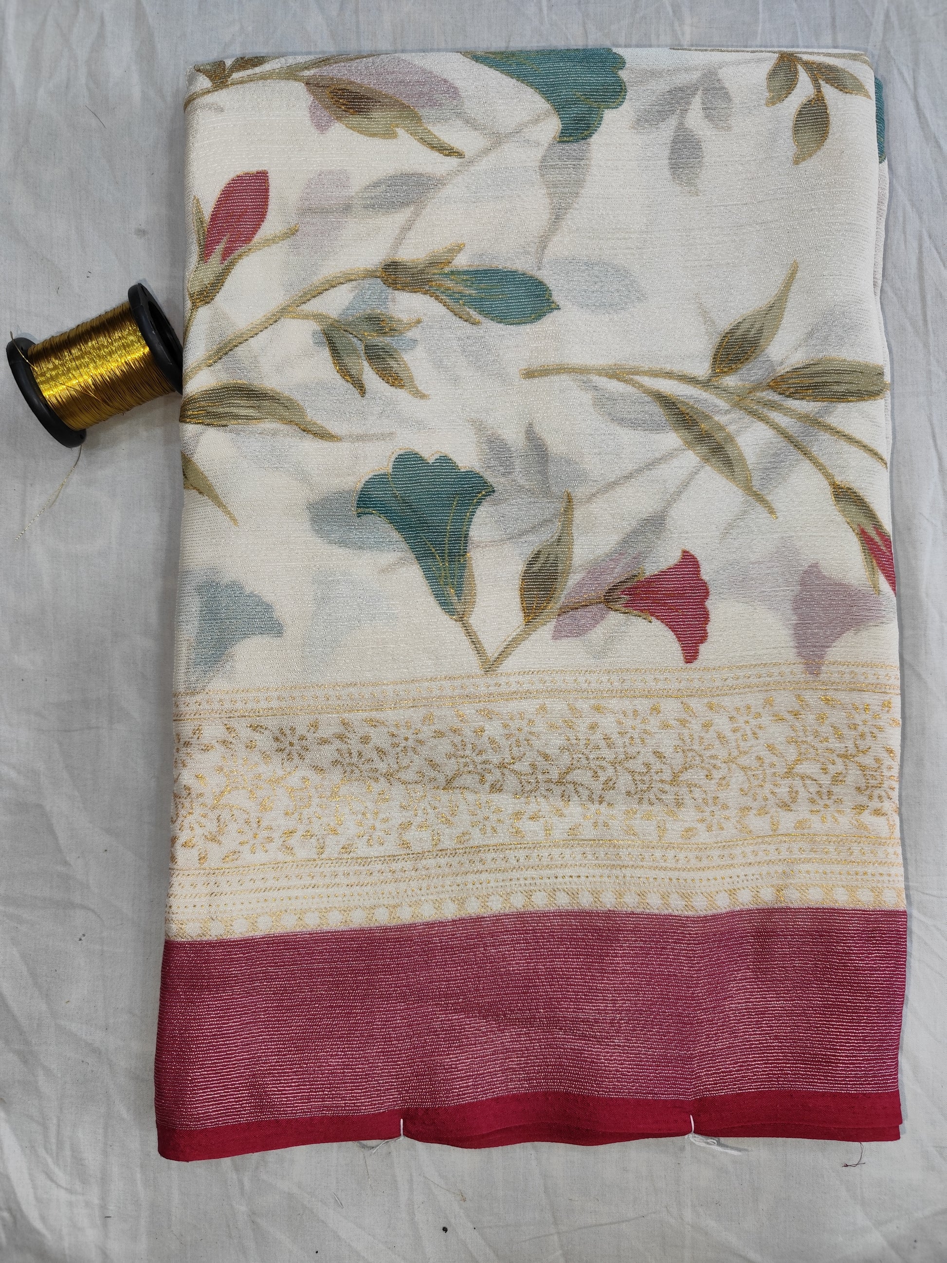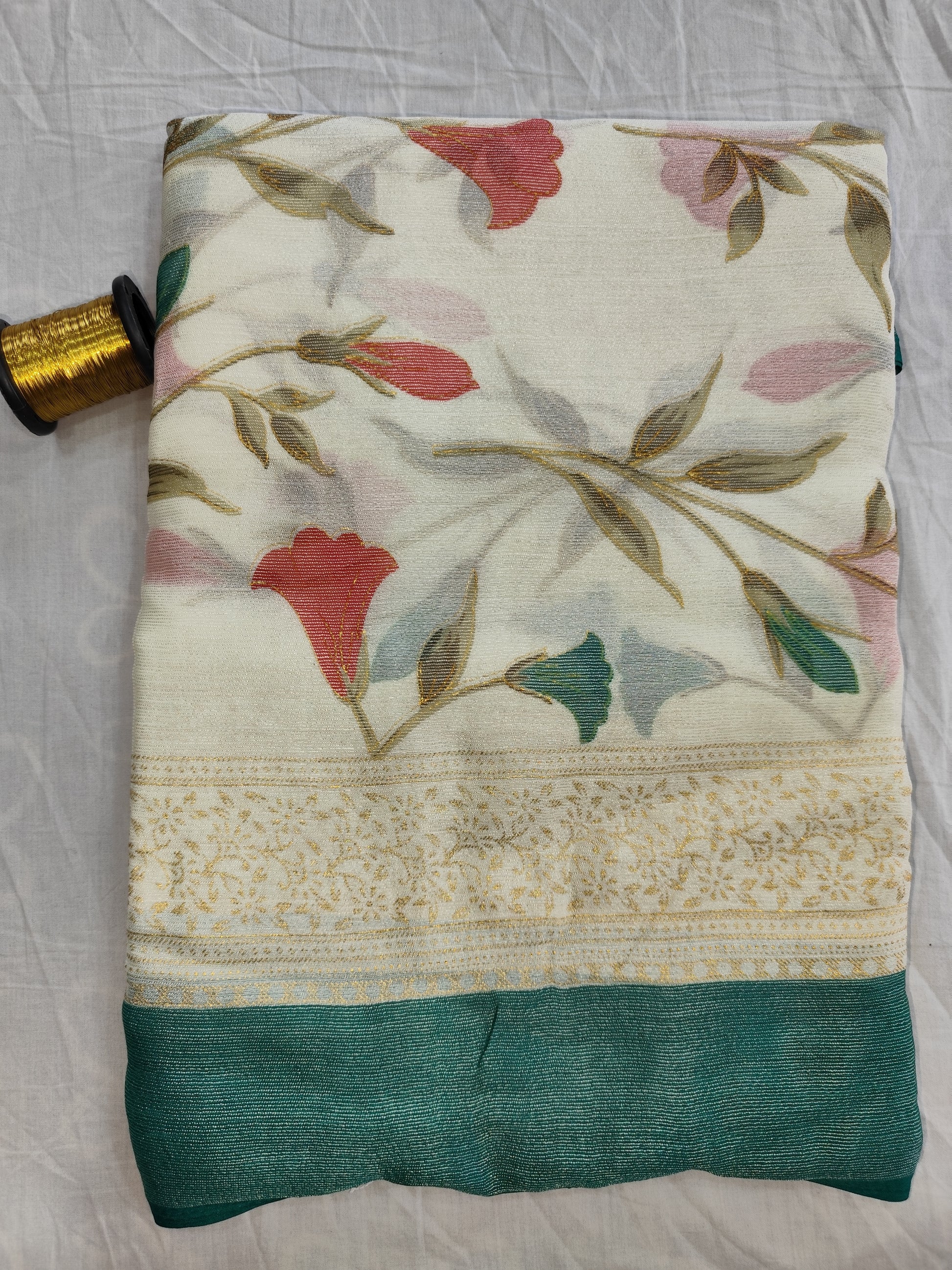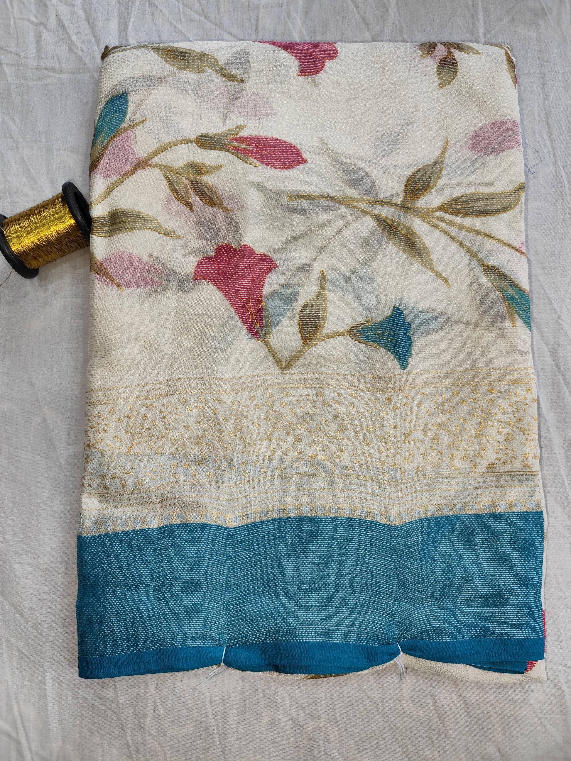 This elegant Floral Semi-Silk Saree features a stunning floral pattern with a subtle small border and comes with a stylish contrast blouse, making it ideal for office wear and daily use. Lightweight and vibrant, it offers all-day comfort with timeless ethnic charm.