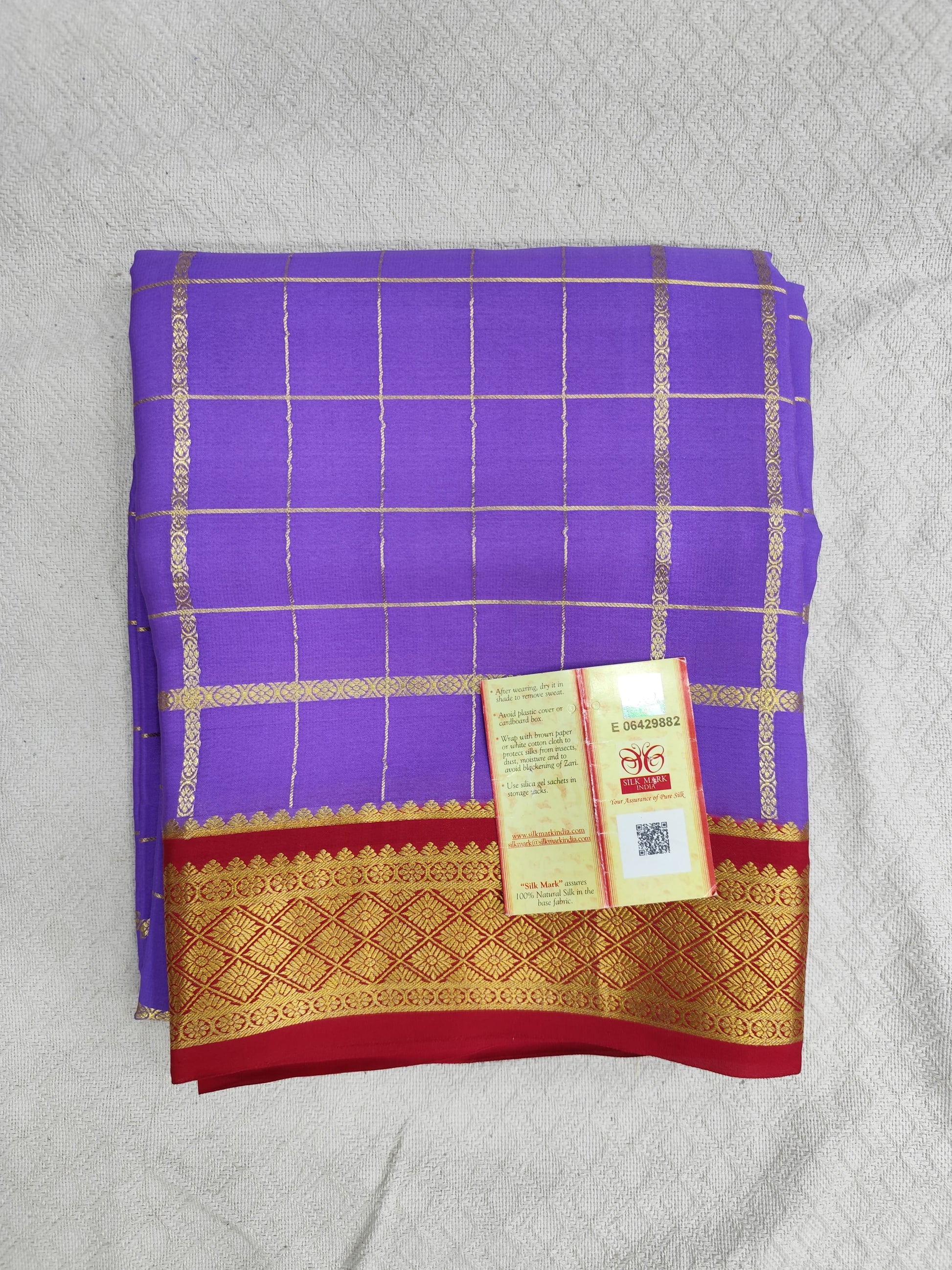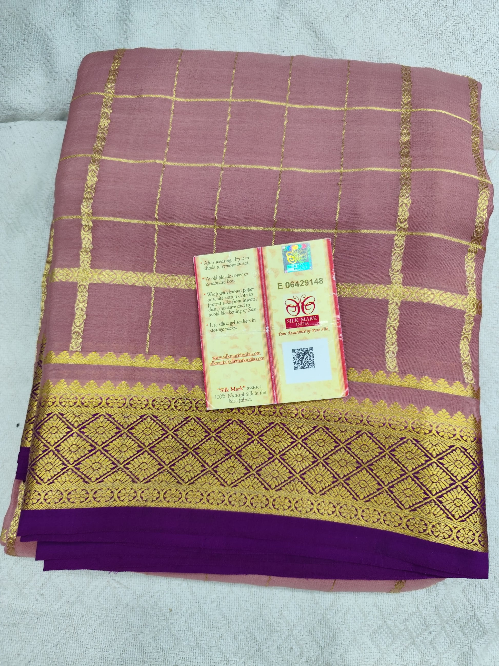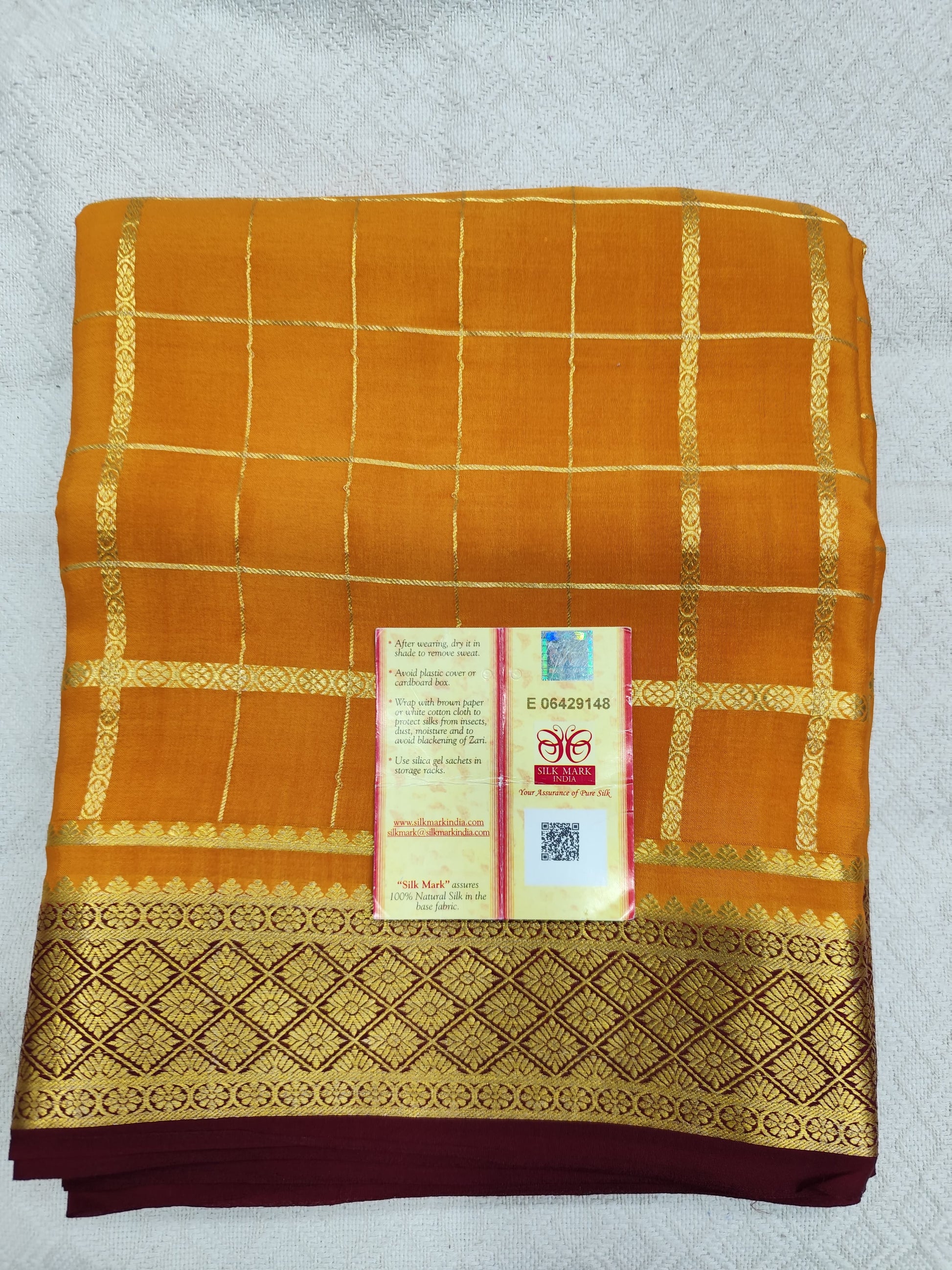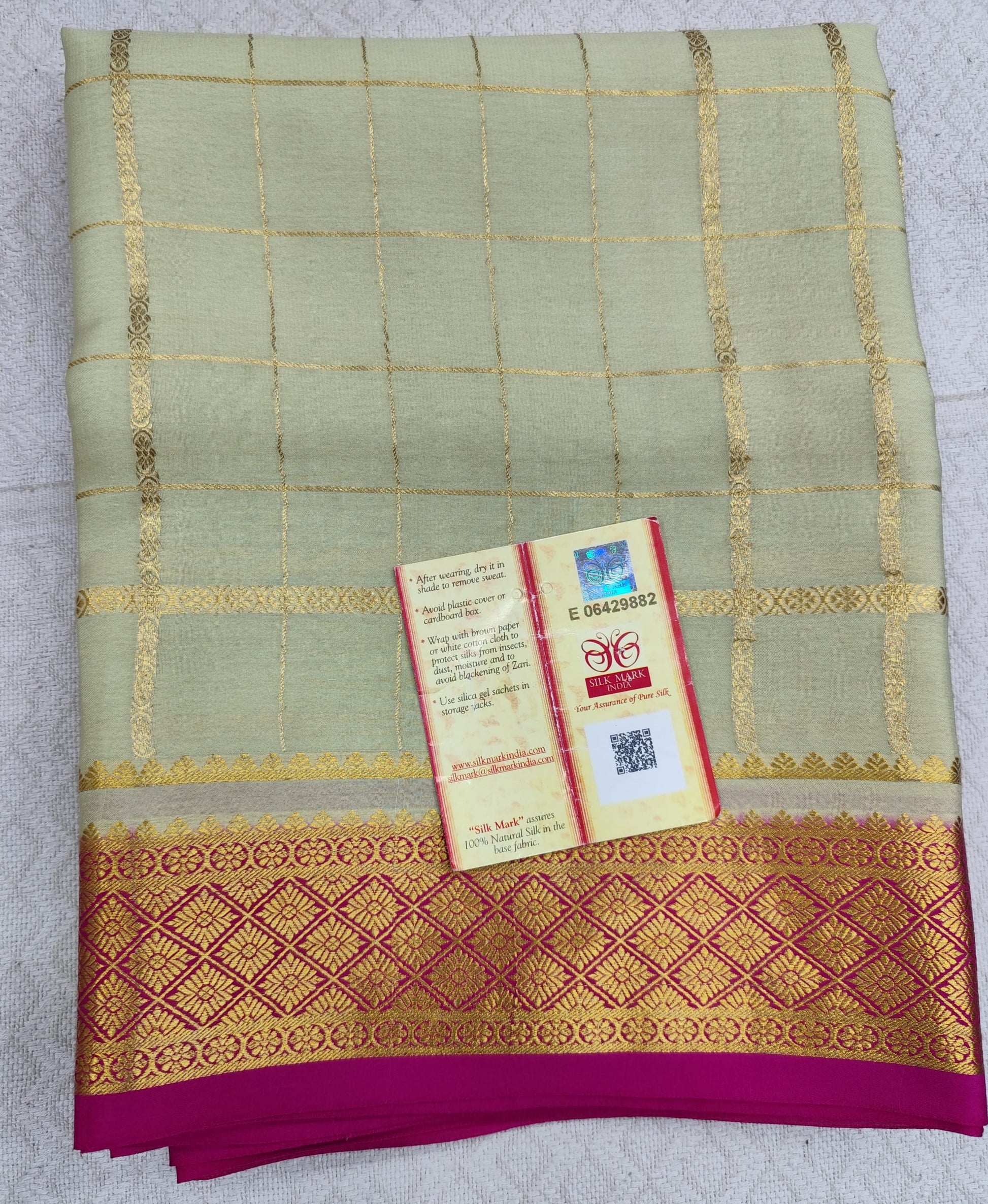 Pure Mysore Crepe Silk Saree with Checks Pattern & Contrast Gold Zari Border – Veena Silk