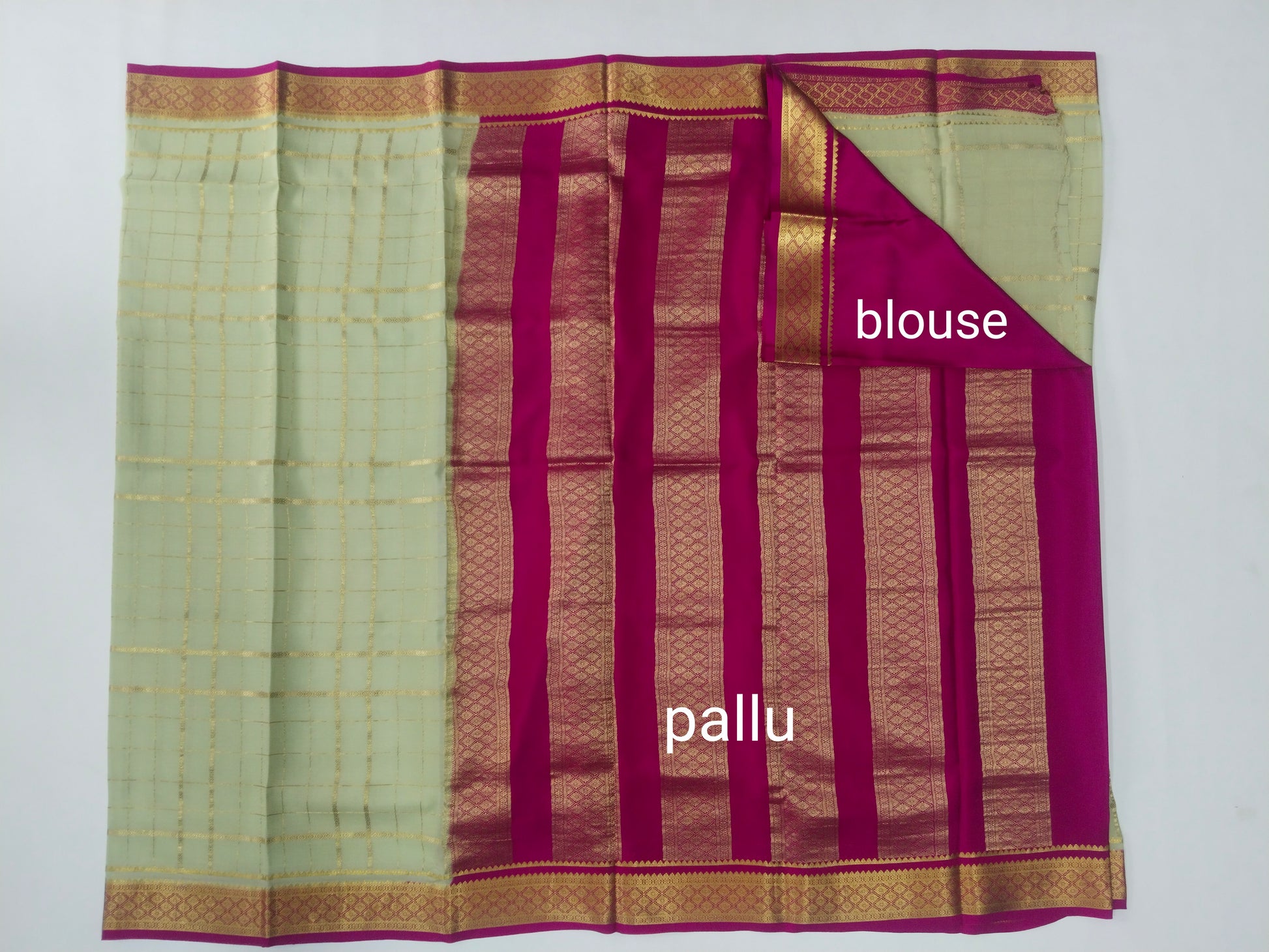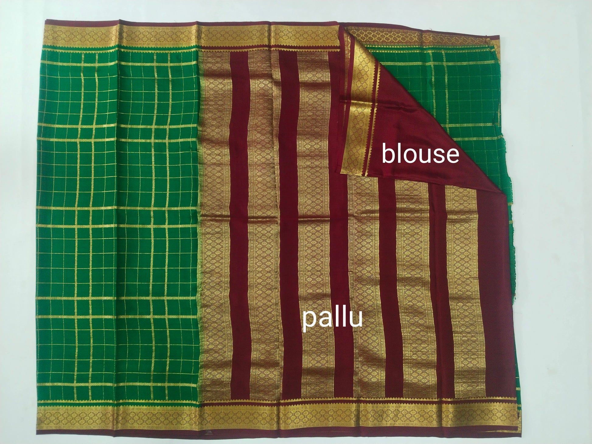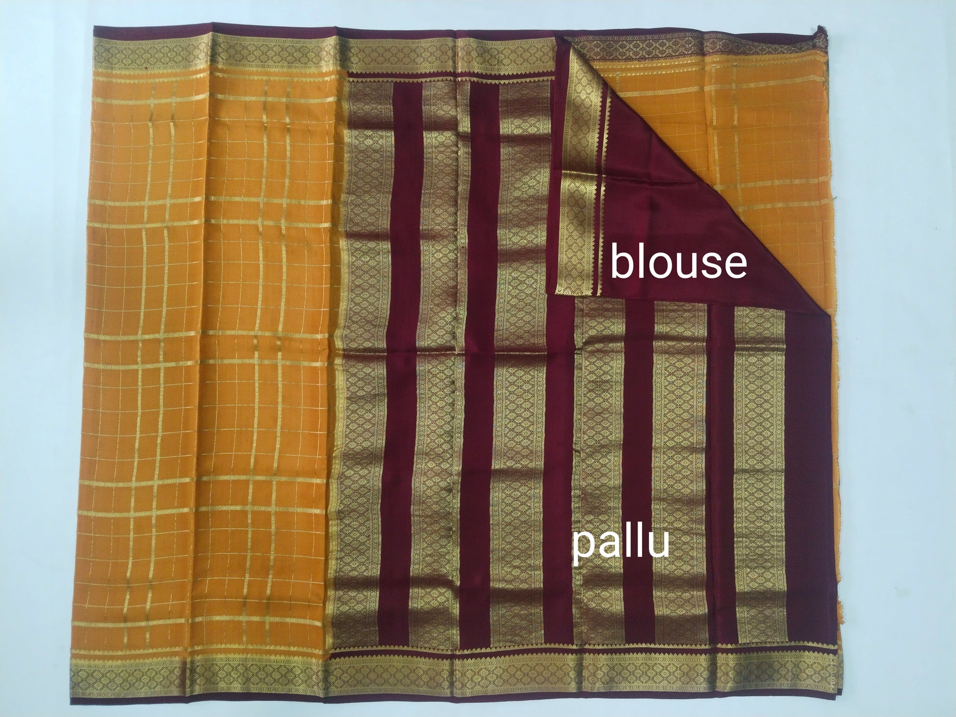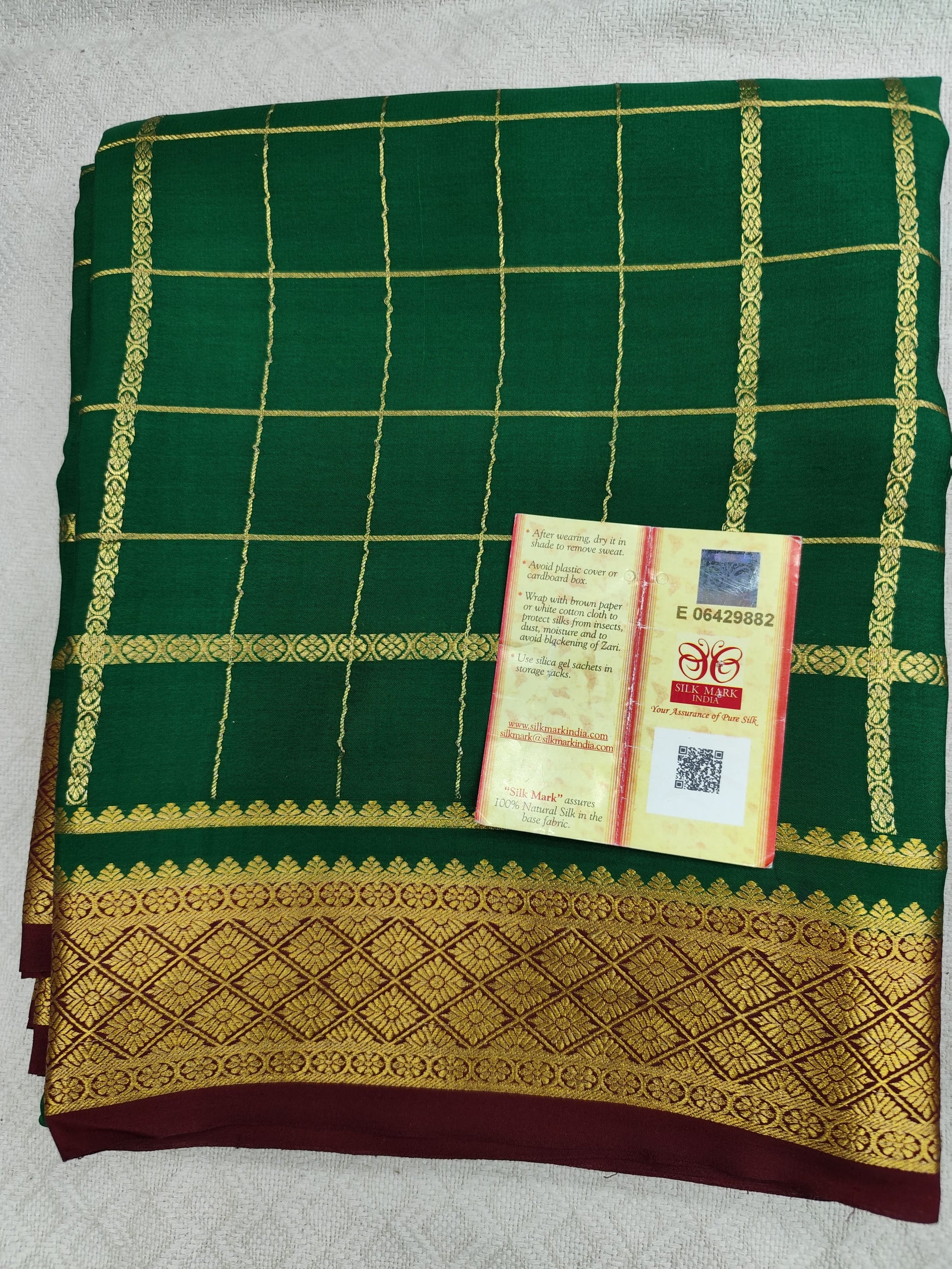 Pure Mysore Crepe Silk Saree with Checks Pattern & Contrast Gold Zari Border – Veena Silk