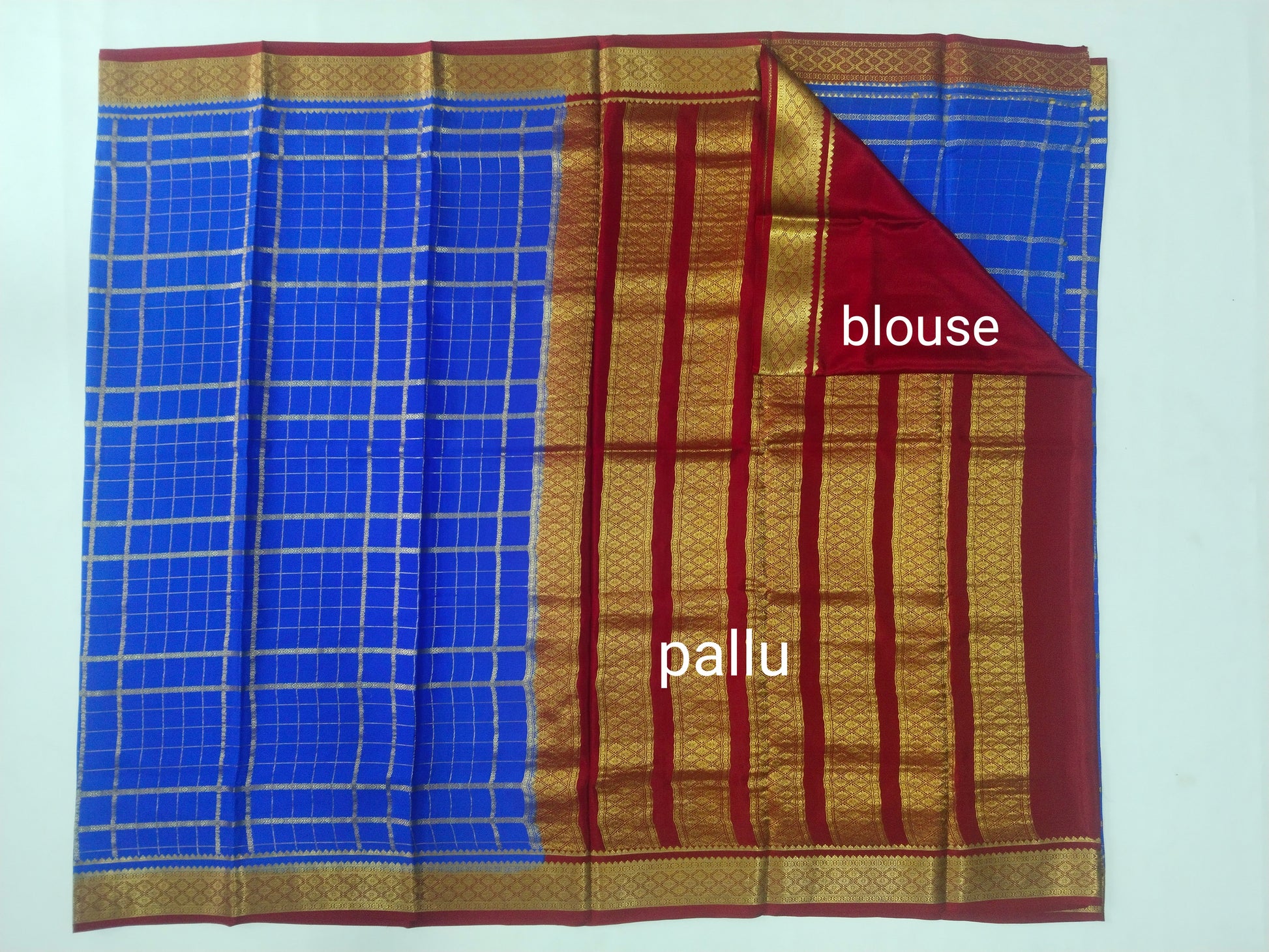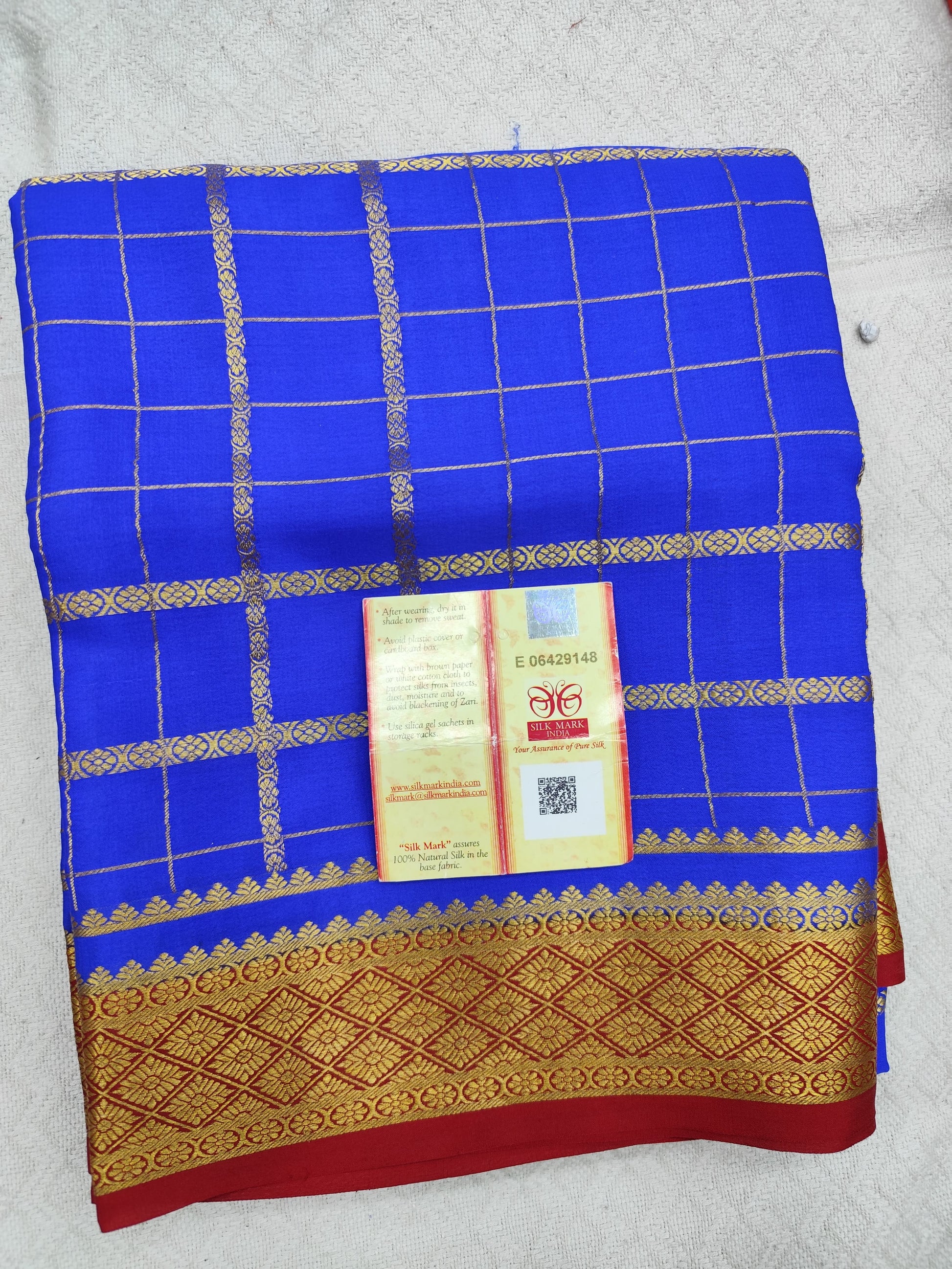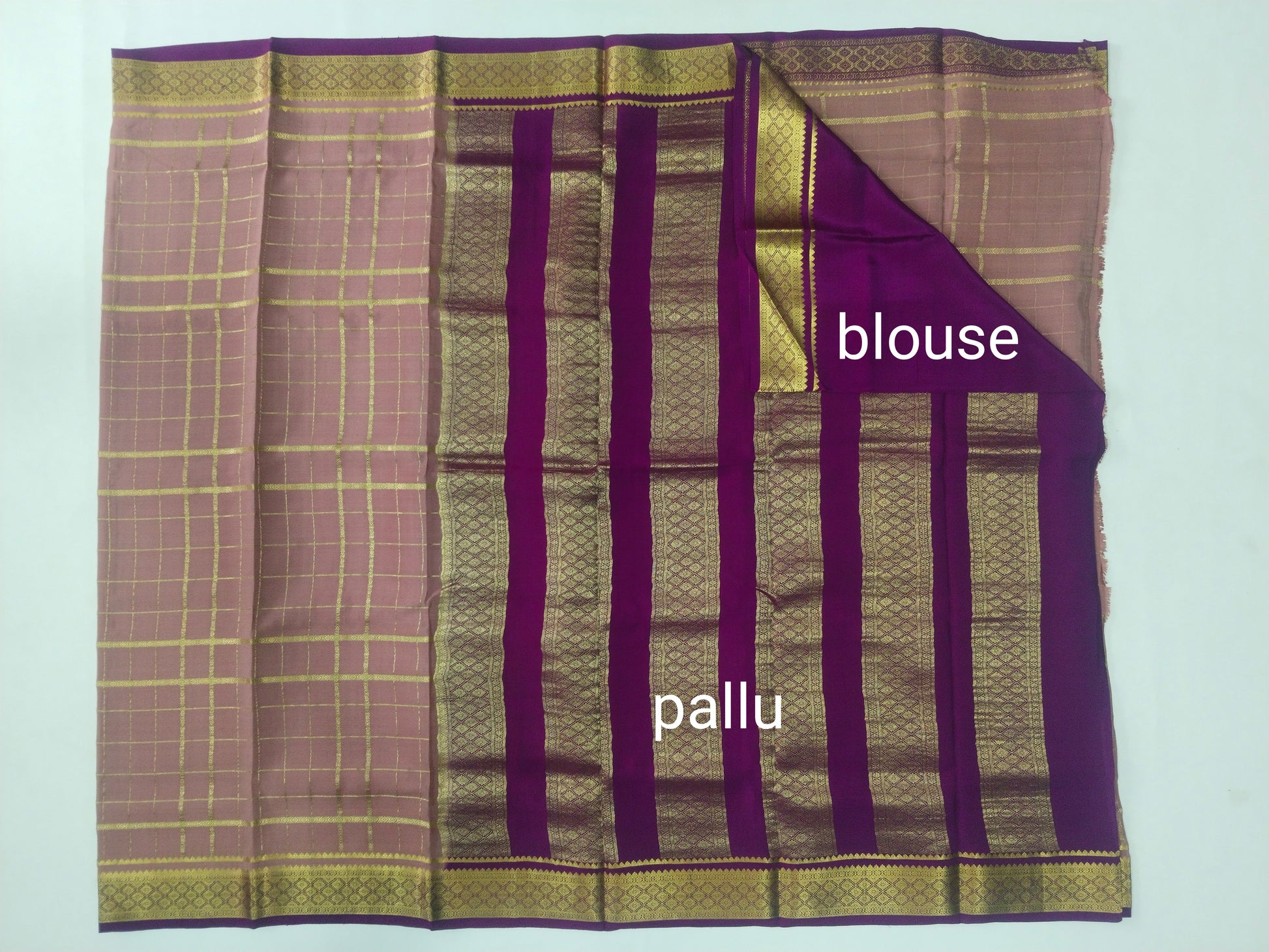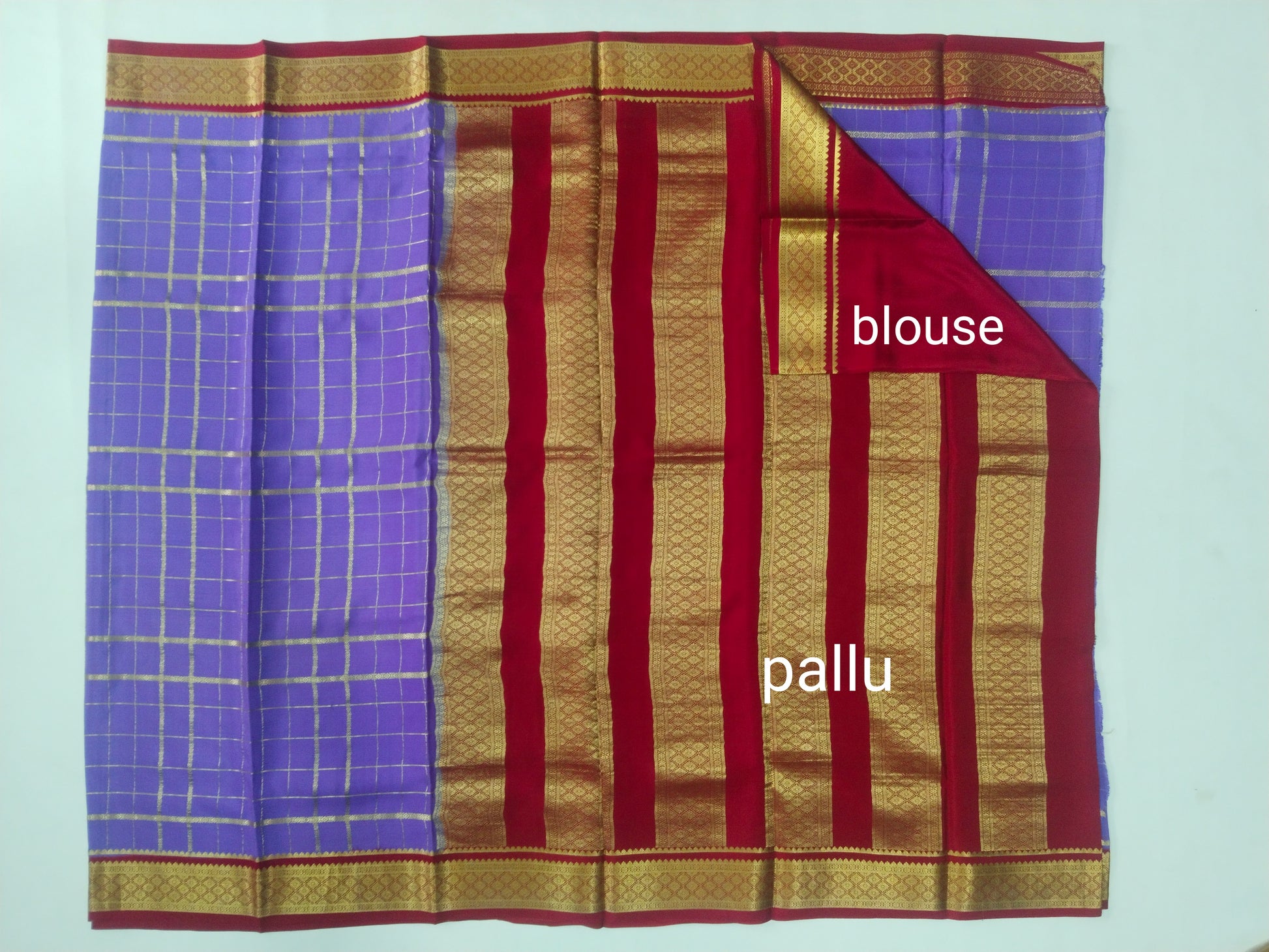 Pure Mysore Crepe Silk Saree with Checks Pattern & Contrast Gold Zari Border – Veena Silk