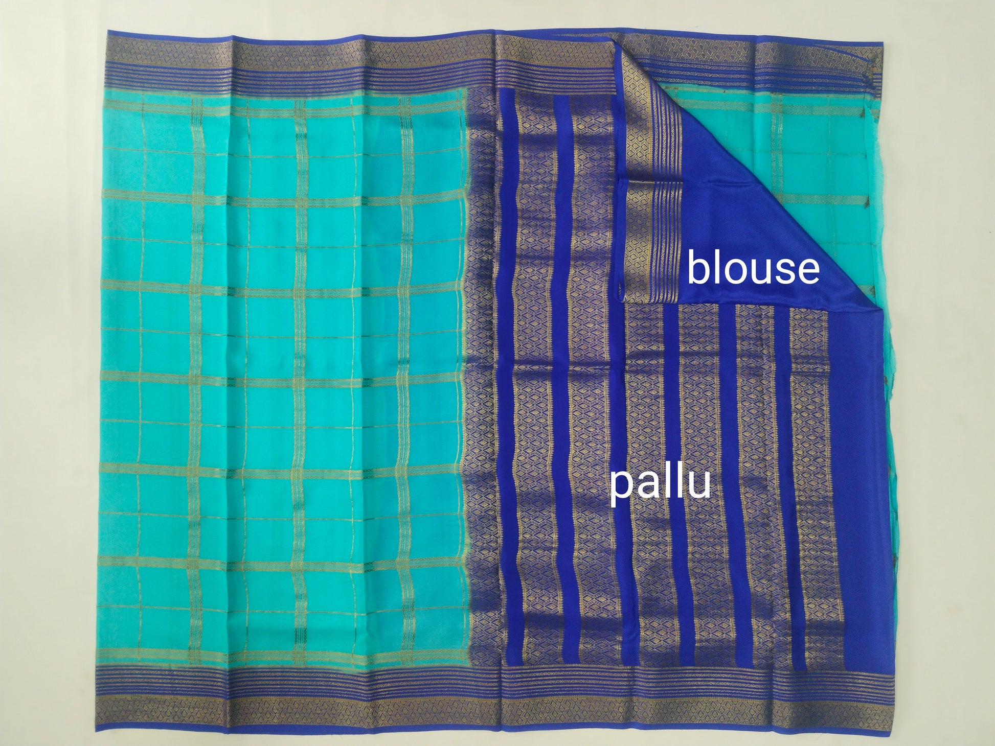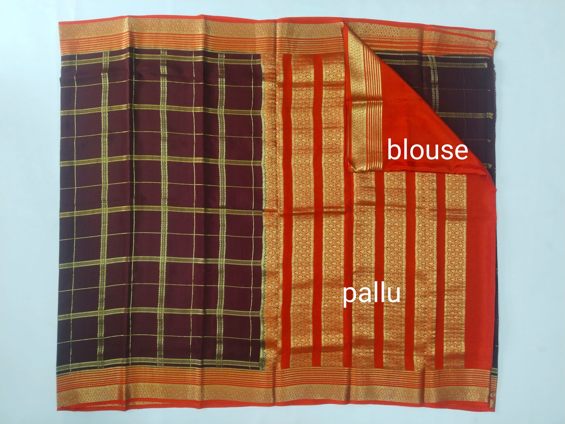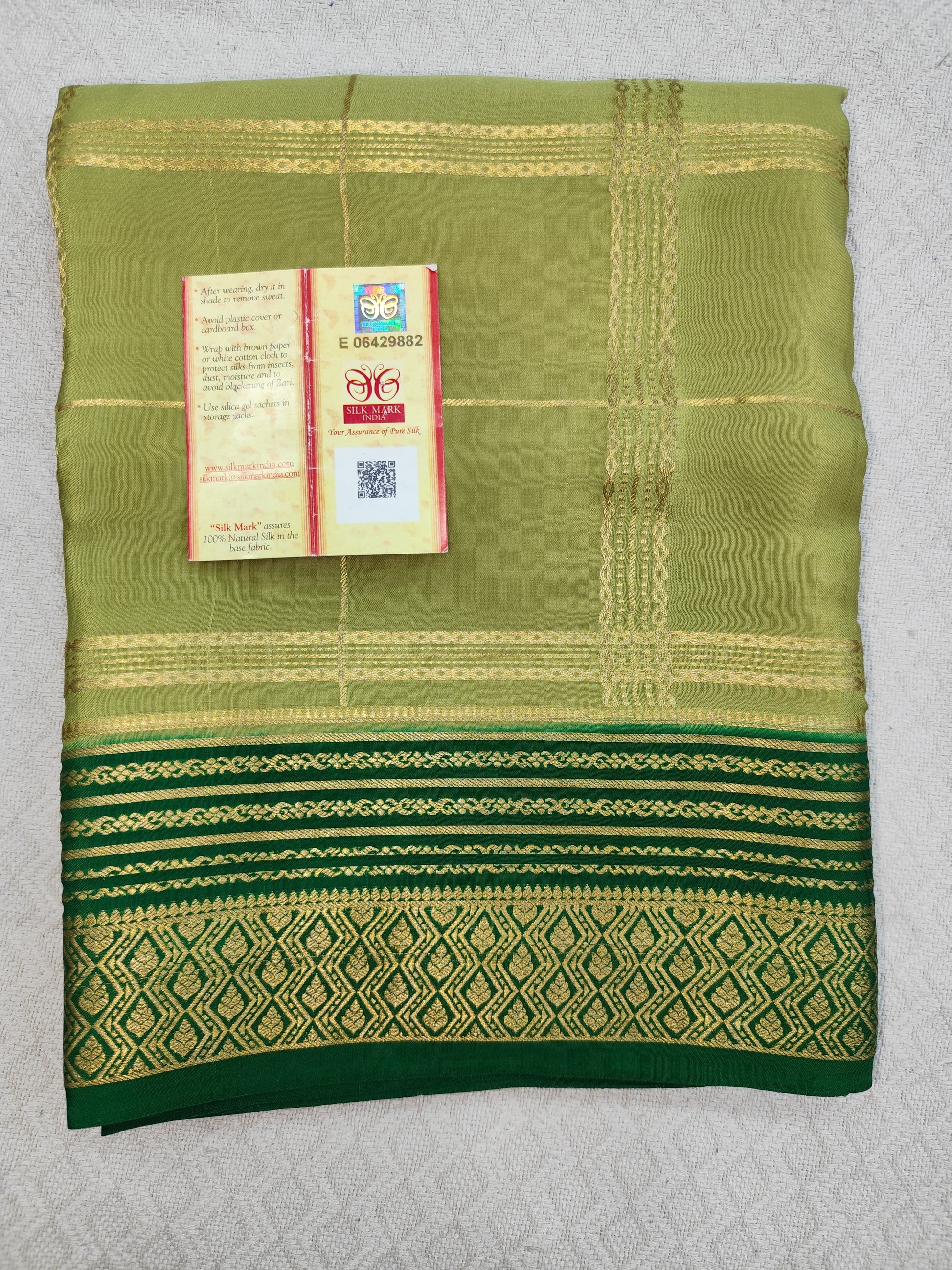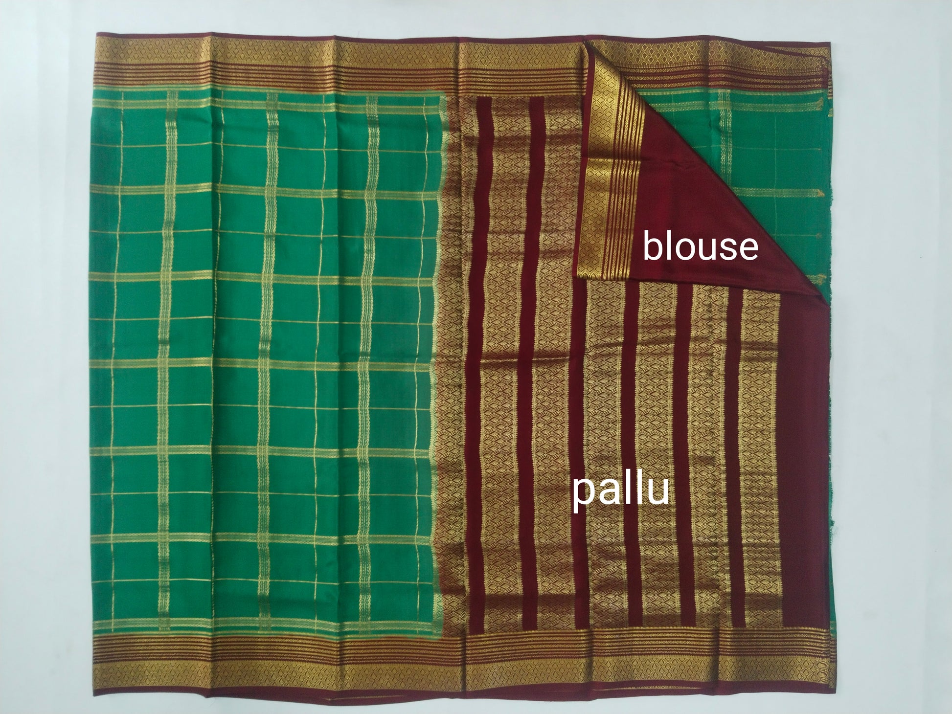 Pure Mysore Crepe Silk Saree with Rich Zari Border & Contrast Checks – Veena Silk