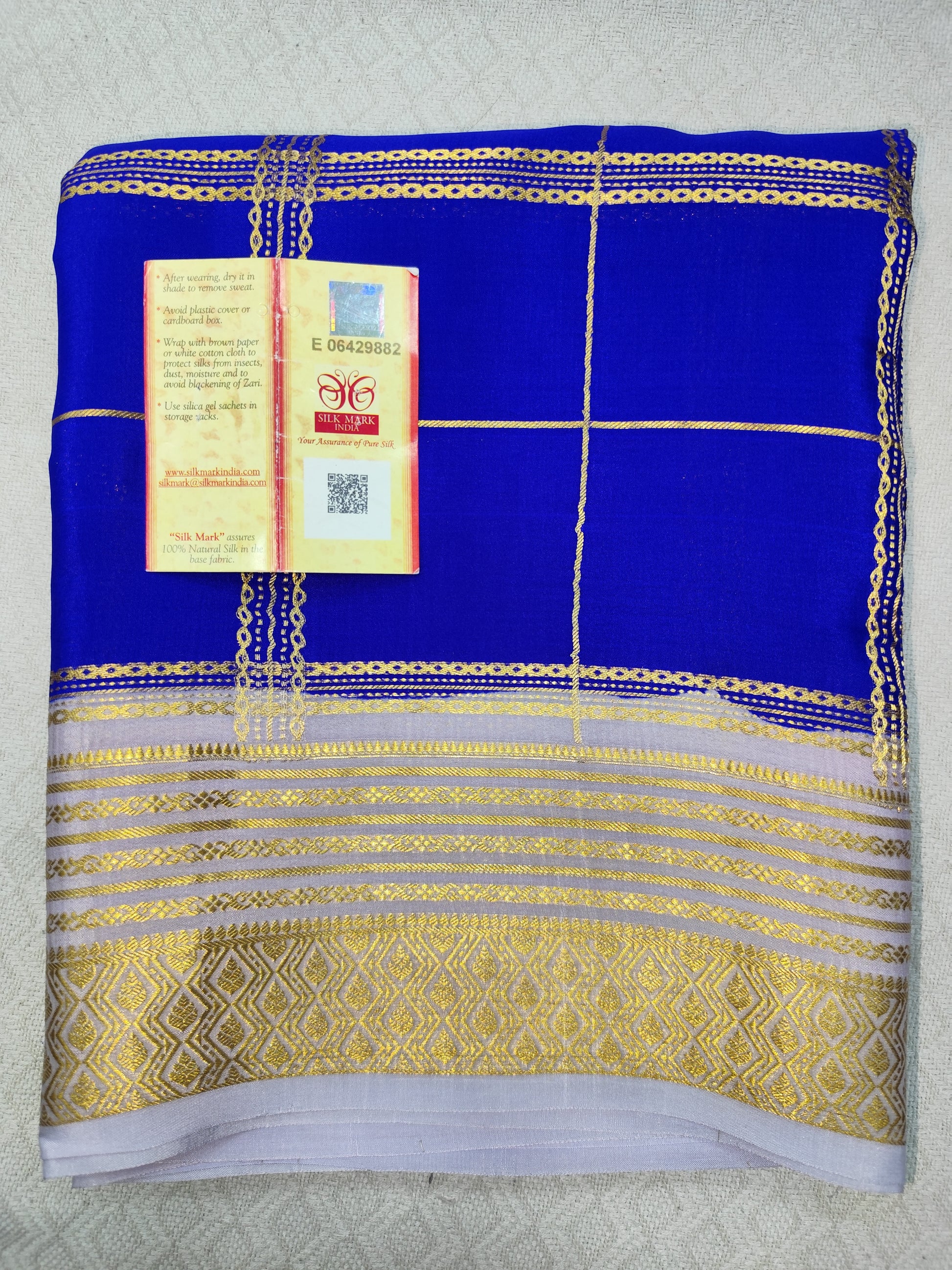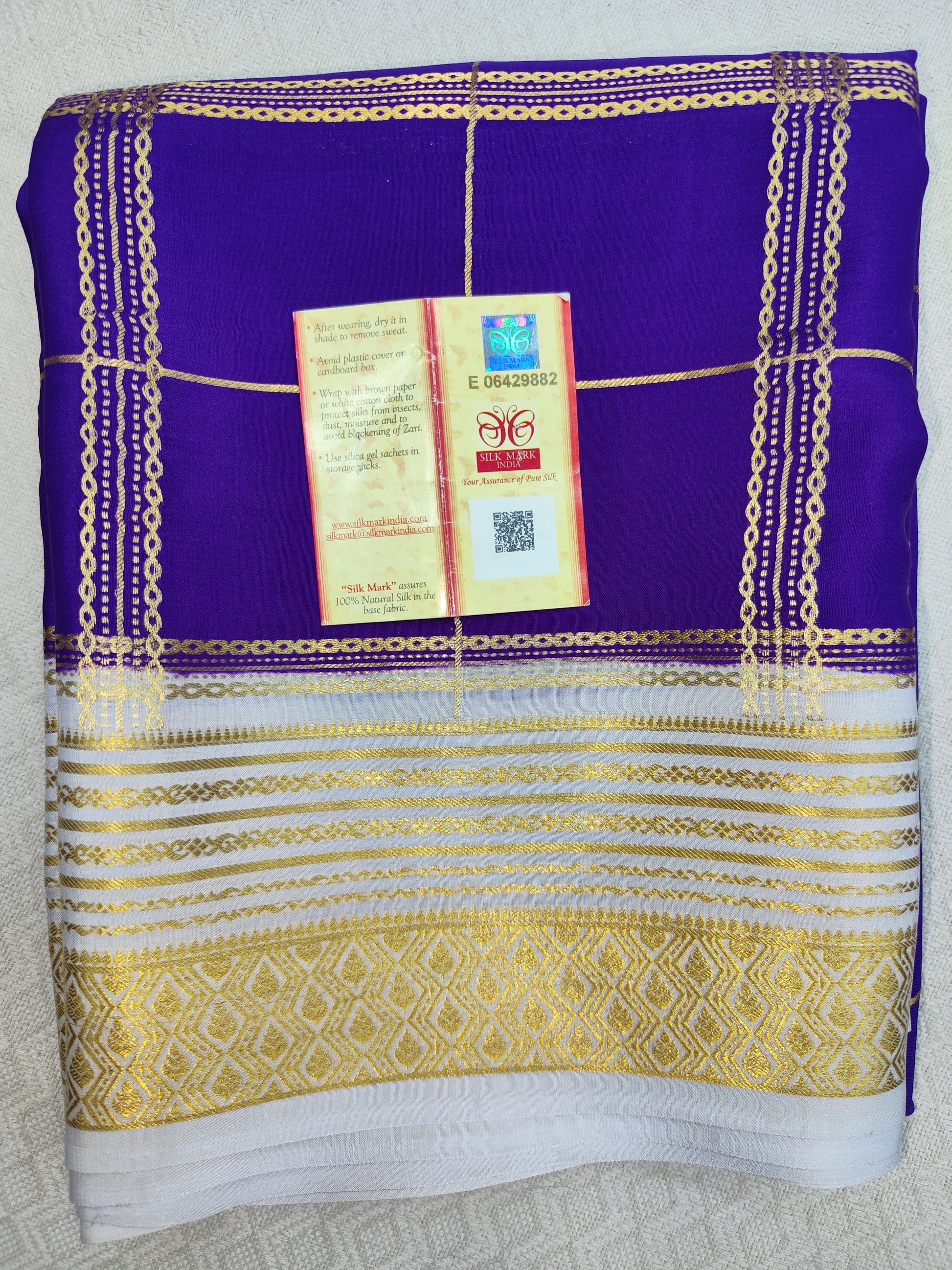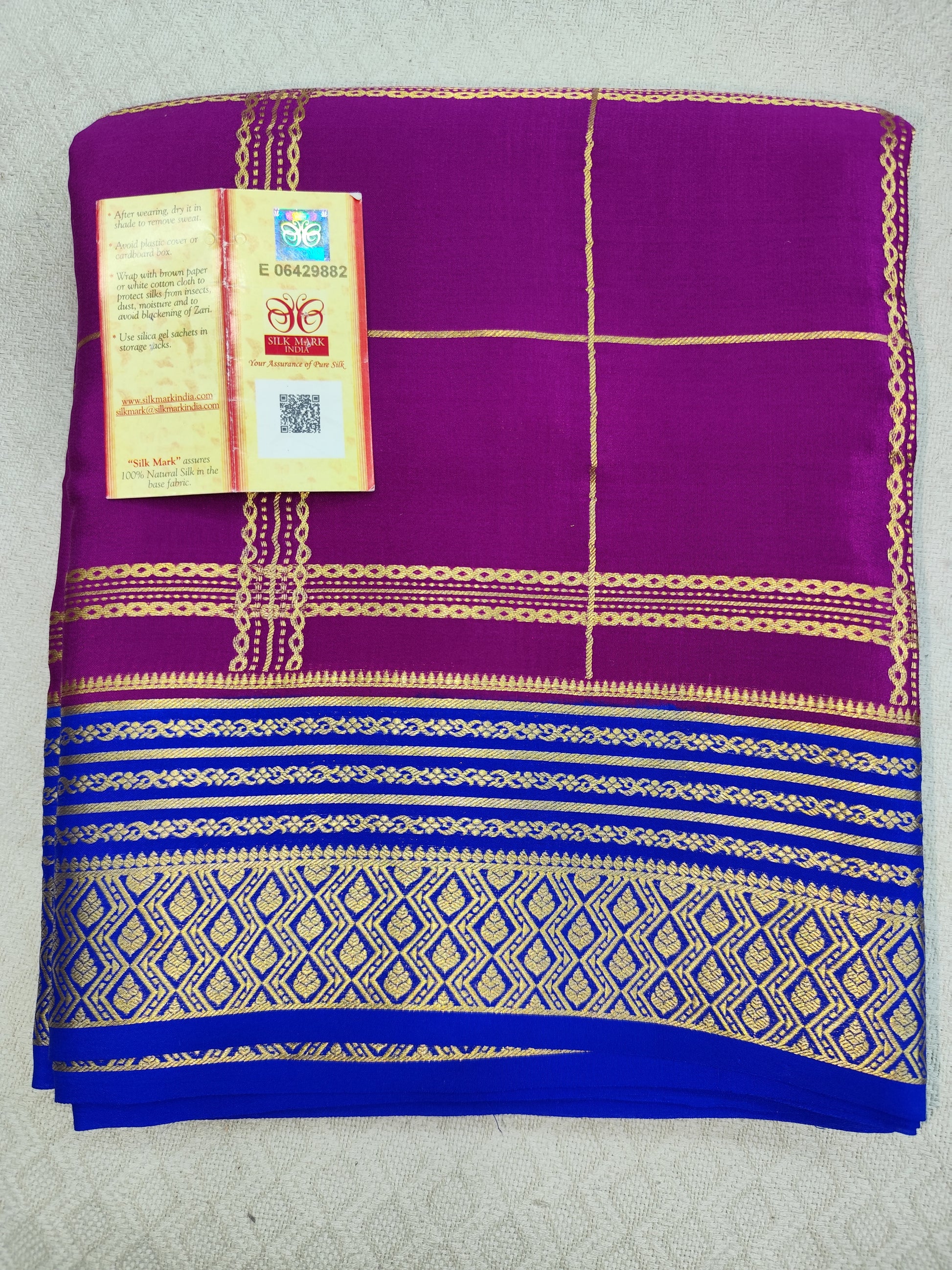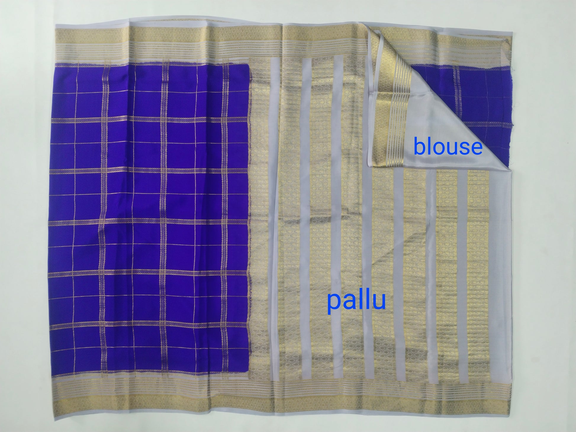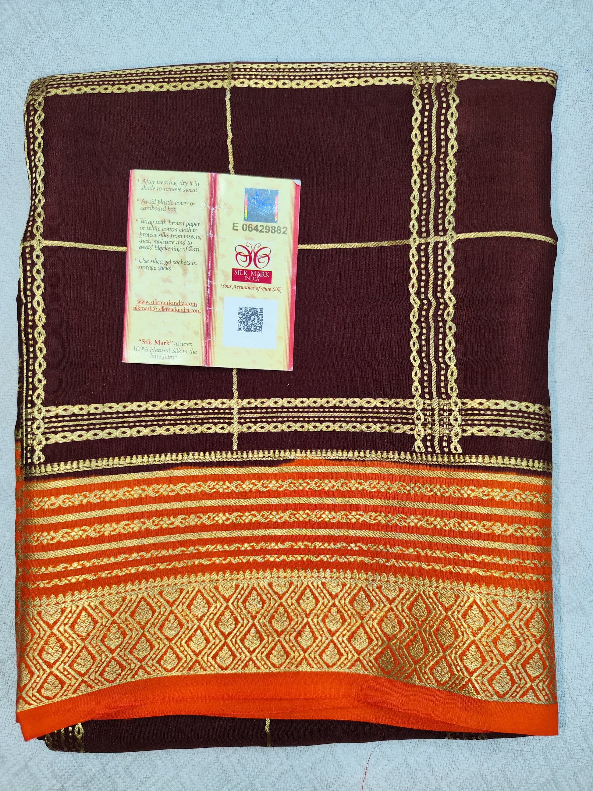 Step into timeless grace with this Pure Mysore Crepe Silk Saree, adorned with a rich zari border and classic contrast checks pattern. The lustrous silk and elegant detailing make it perfect for festive occasions and traditional functions.
