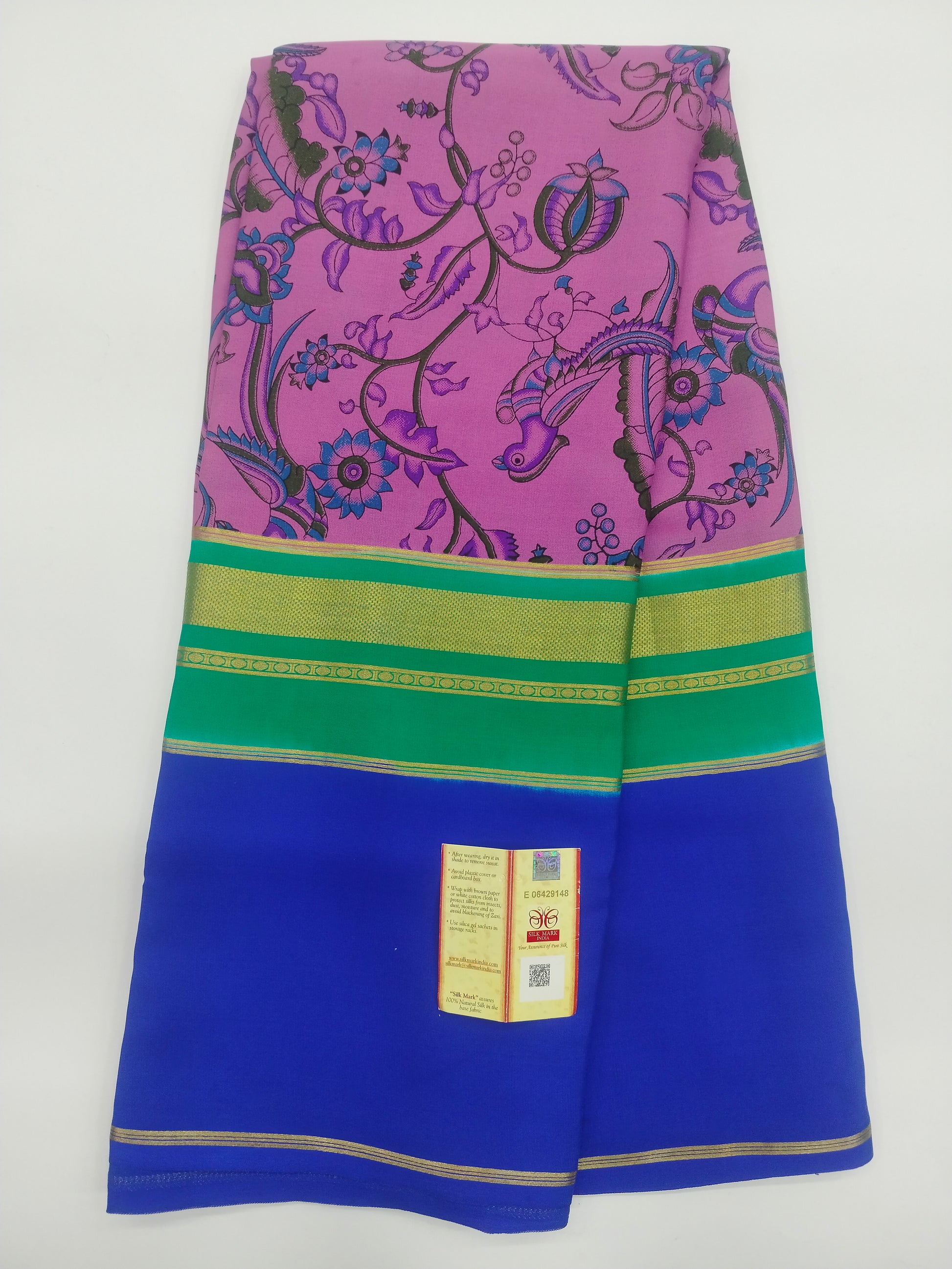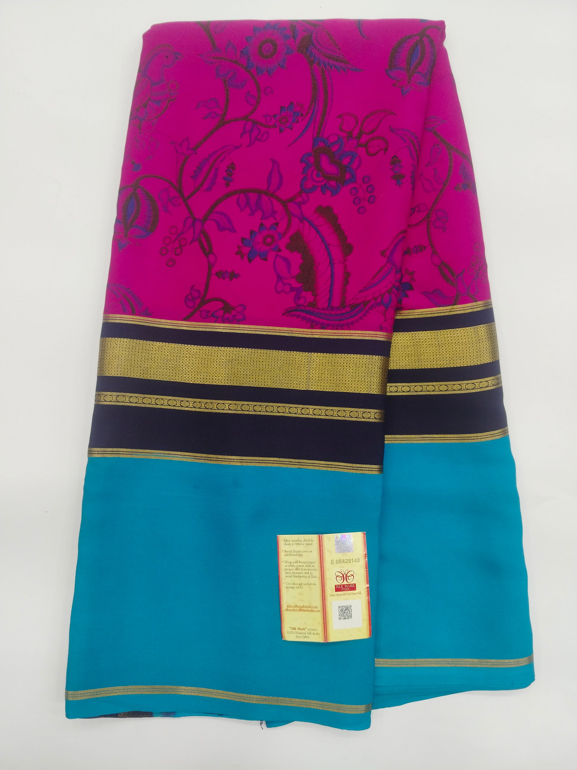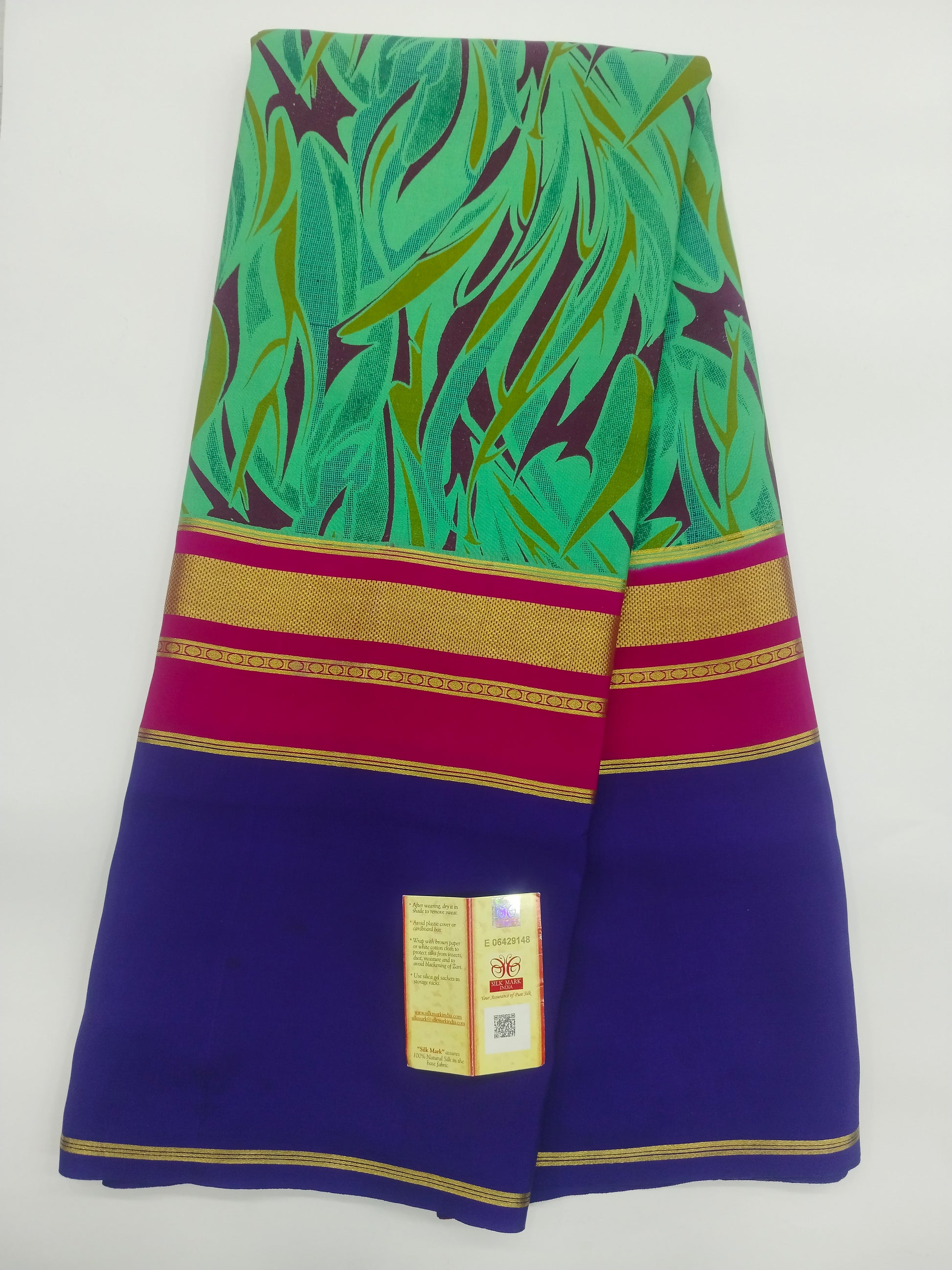 Add a splash of color and comfort to your wardrobe with this Pure Mysore Silk Printed Crepe Saree, featuring vibrant floral prints and a bold contrast border. Known for its soft texture and rich fall, it’s a perfect pick for both casual and festive looks.