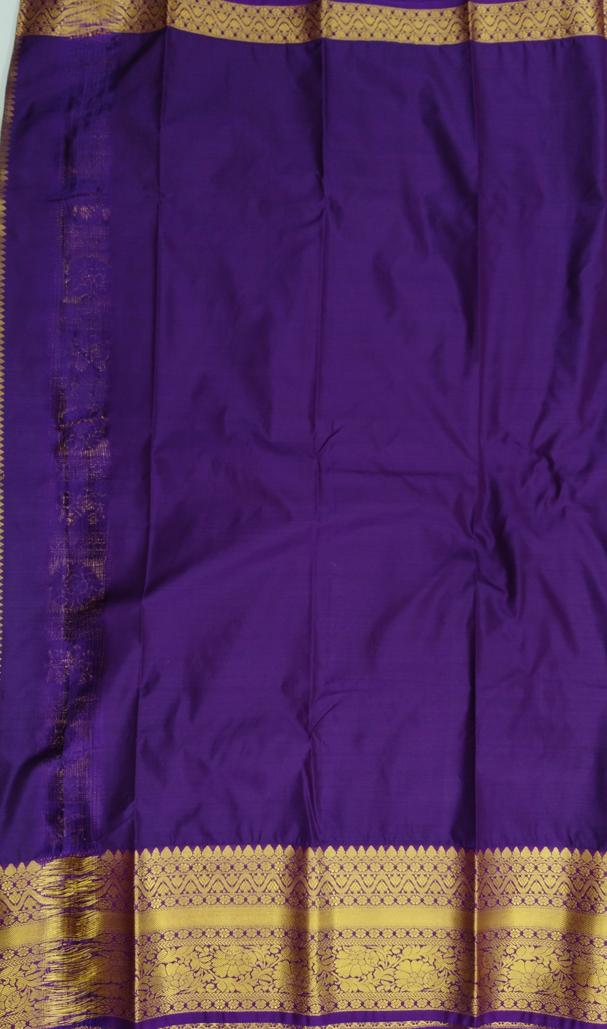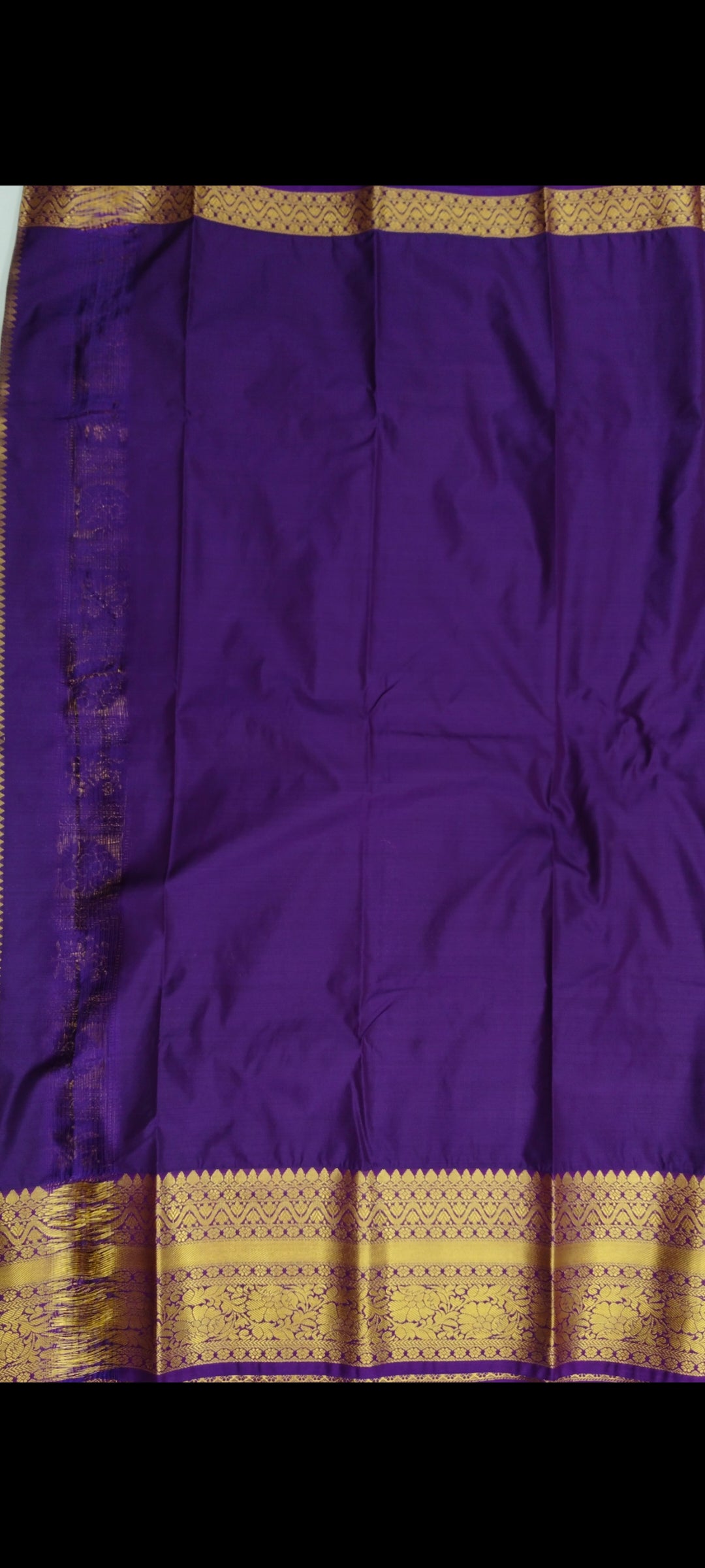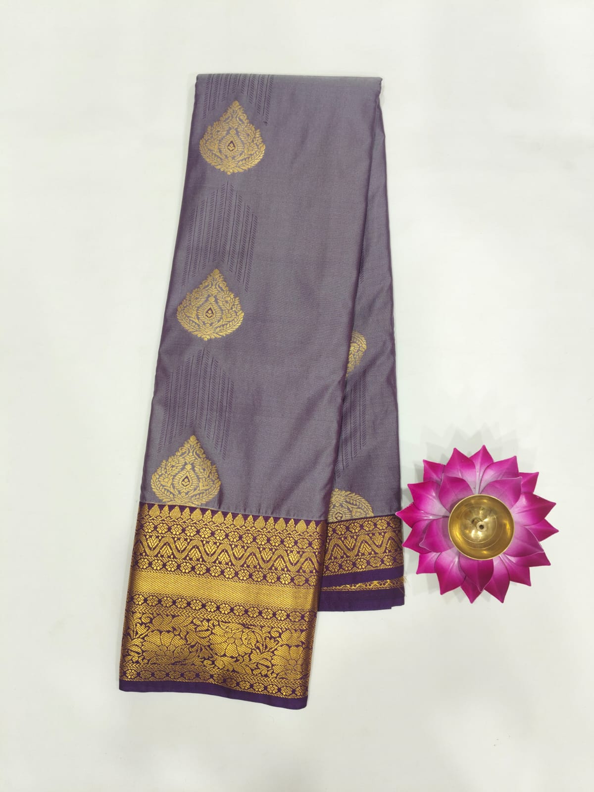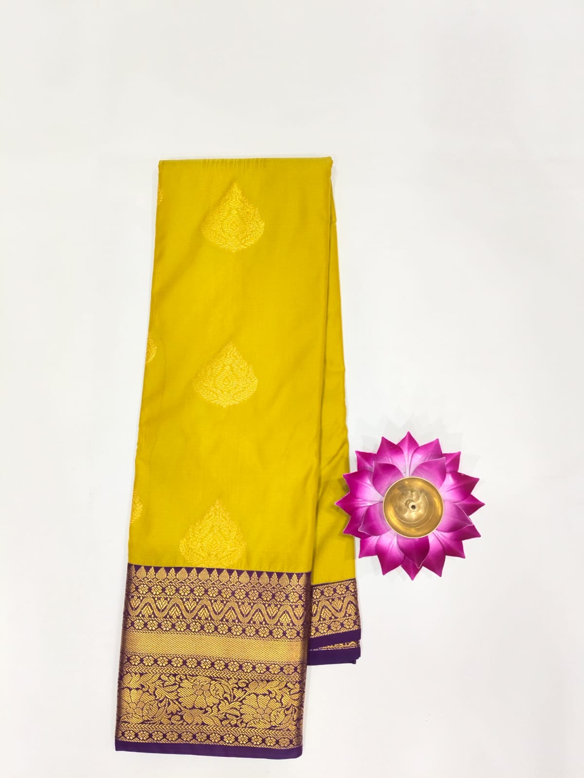 Elevate your festive look with this elegant Semi Kanchipuram Silk Saree, beautifully designed with fancy buta motifs and a stylish fancy line pattern, finished with a contrast gold zari border for a refined traditional appeal.