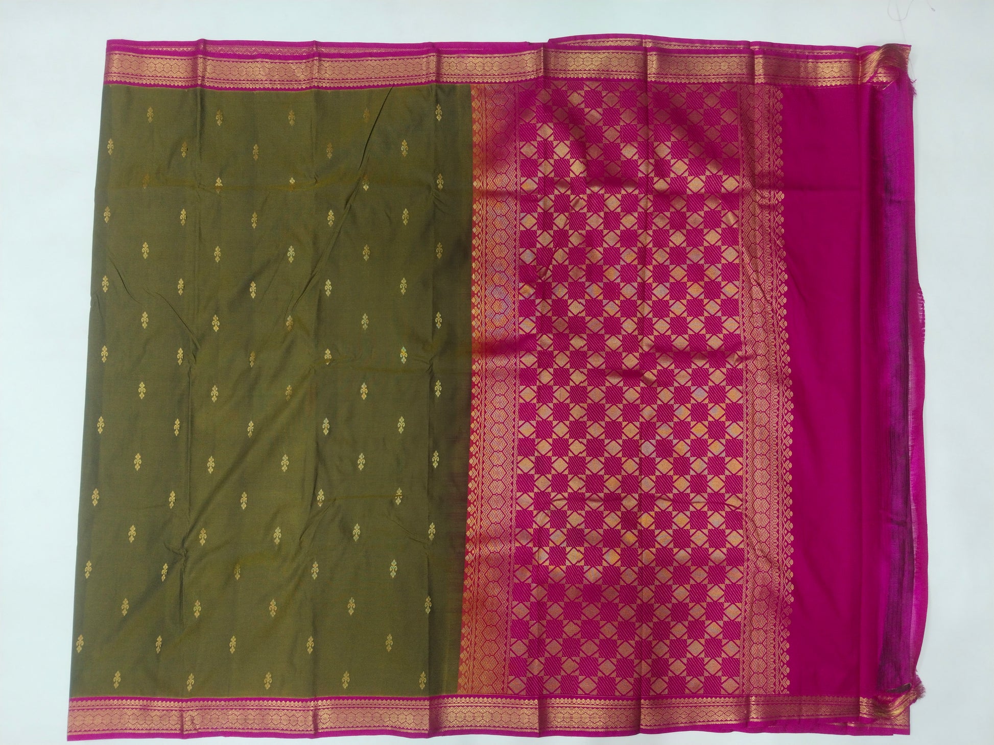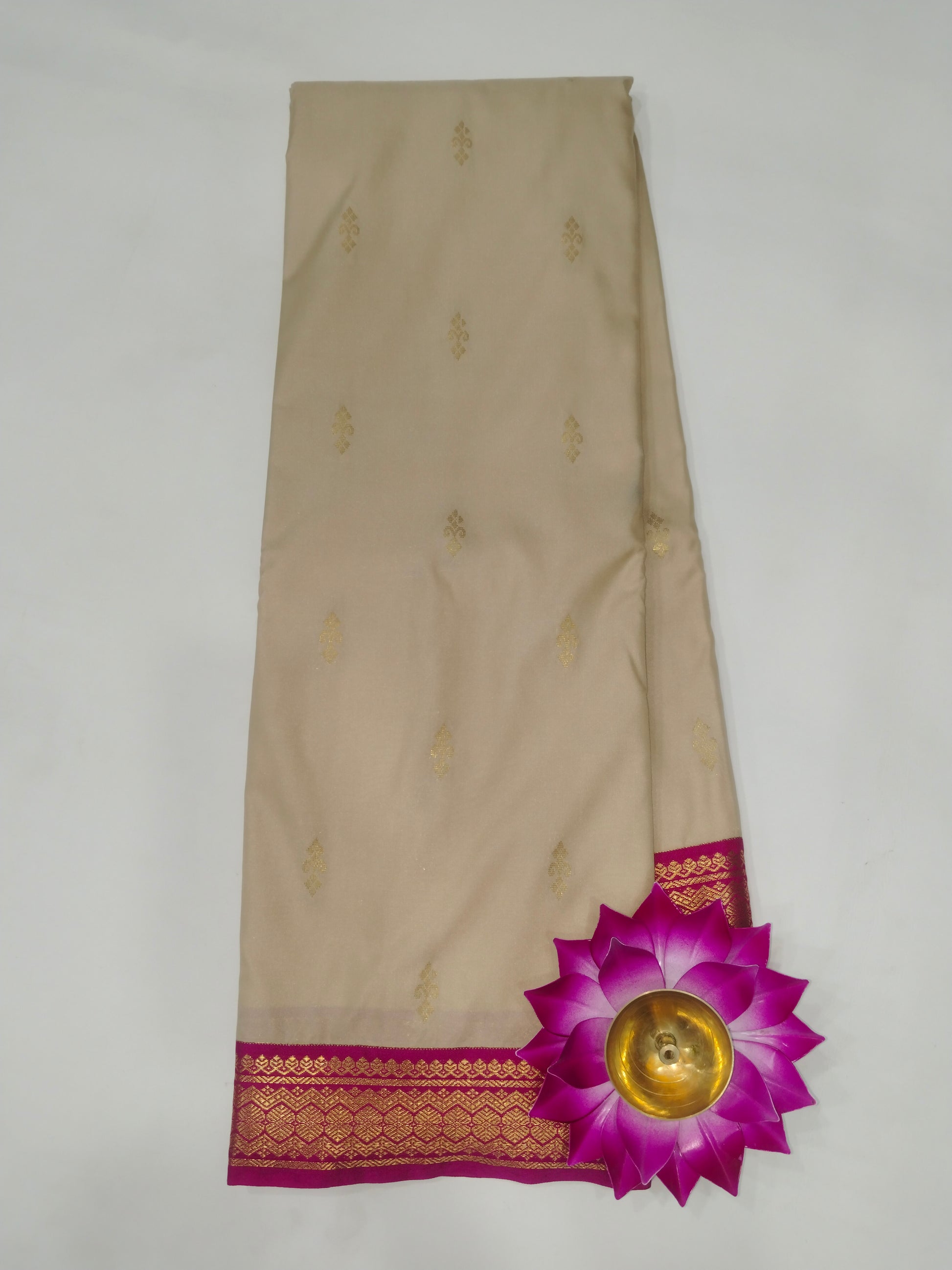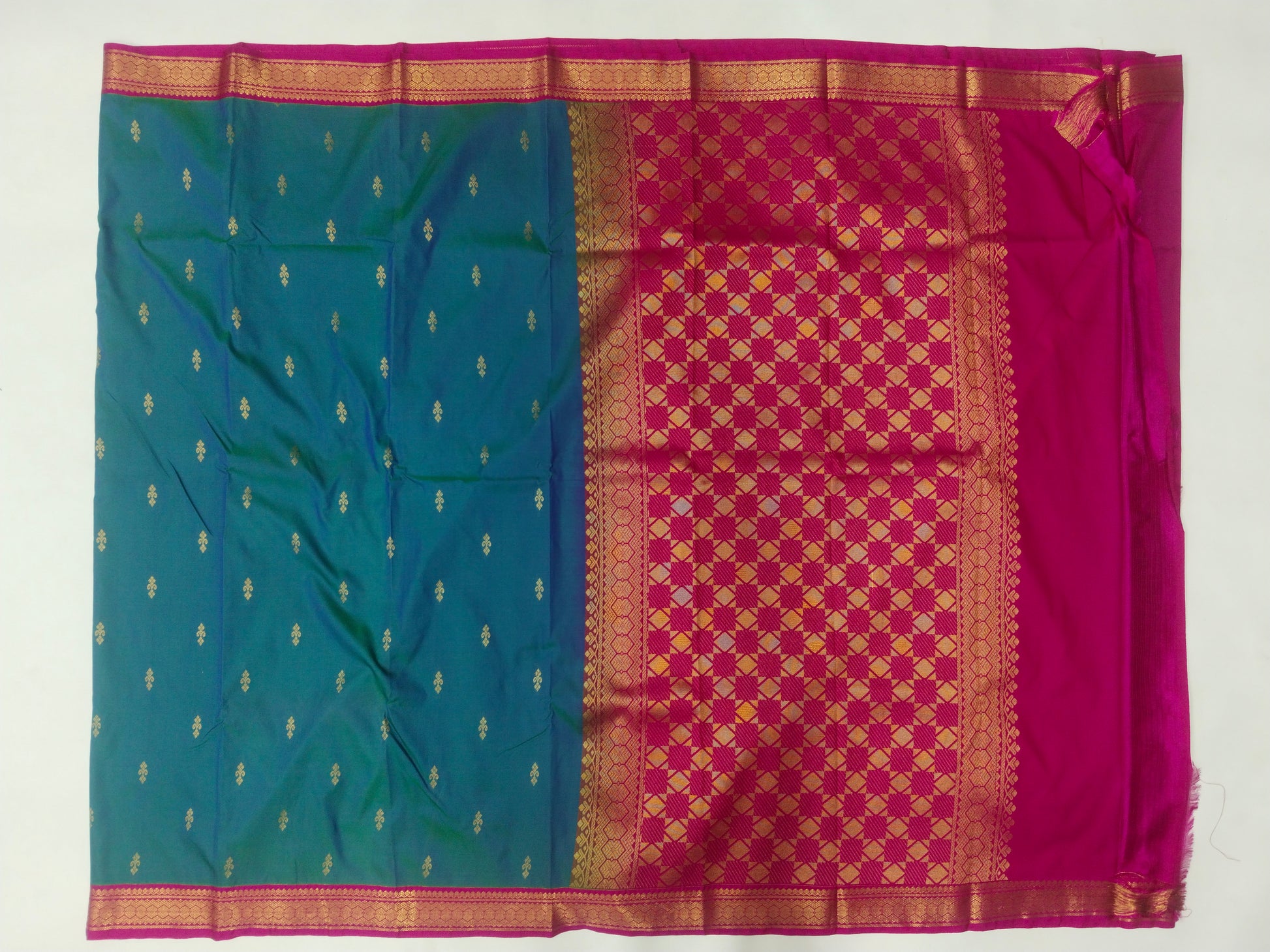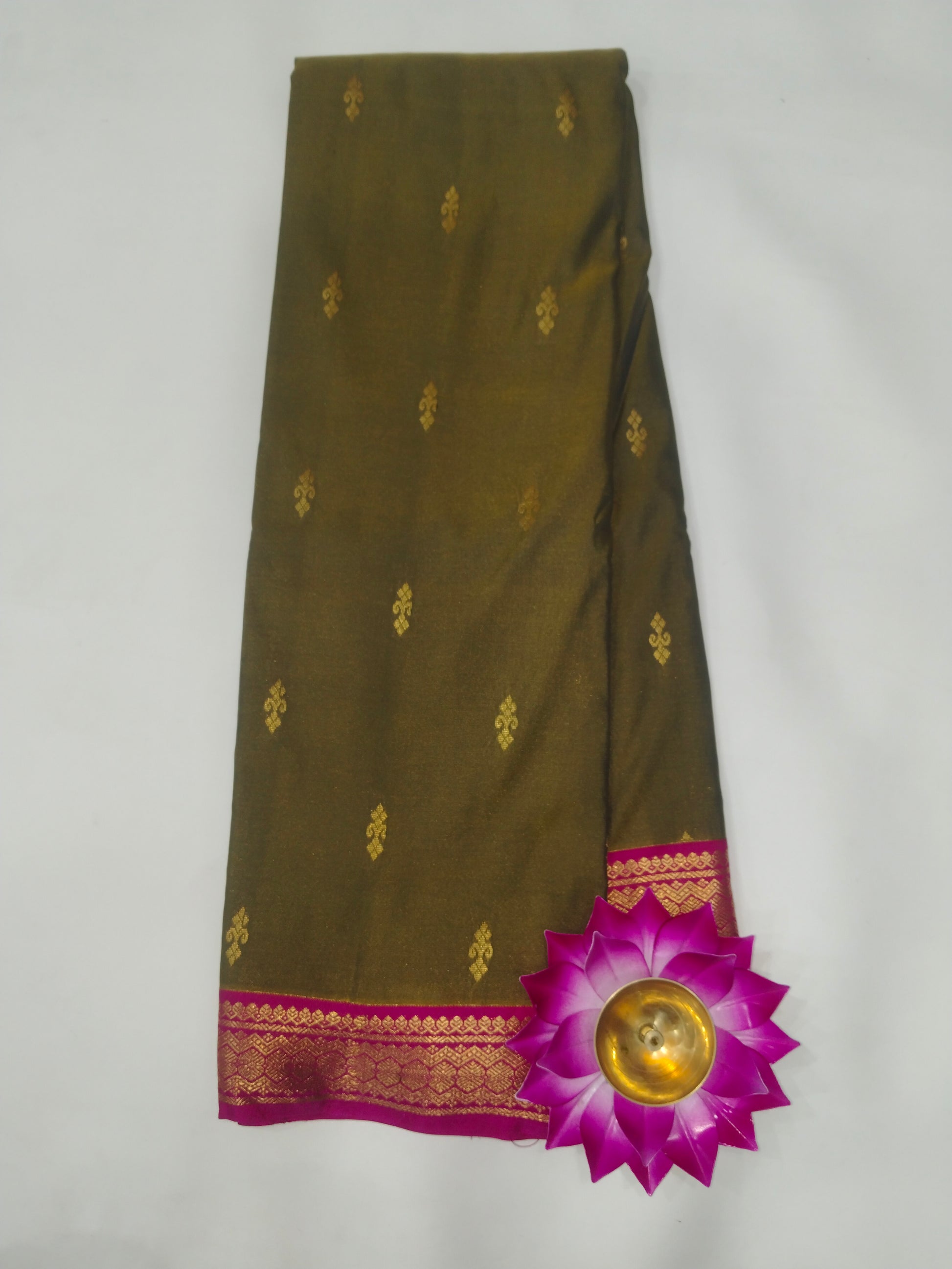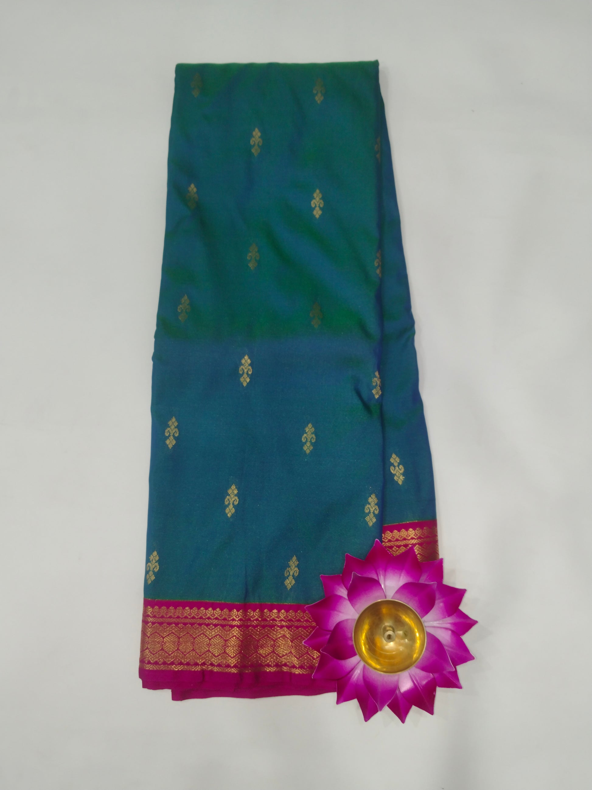Grace your festive occasions with this charming Semi Kanchipuram Silk Saree, featuring delicate small buta motifs, a rich gold zari border, and a contrasting blouse for a complete traditional look.