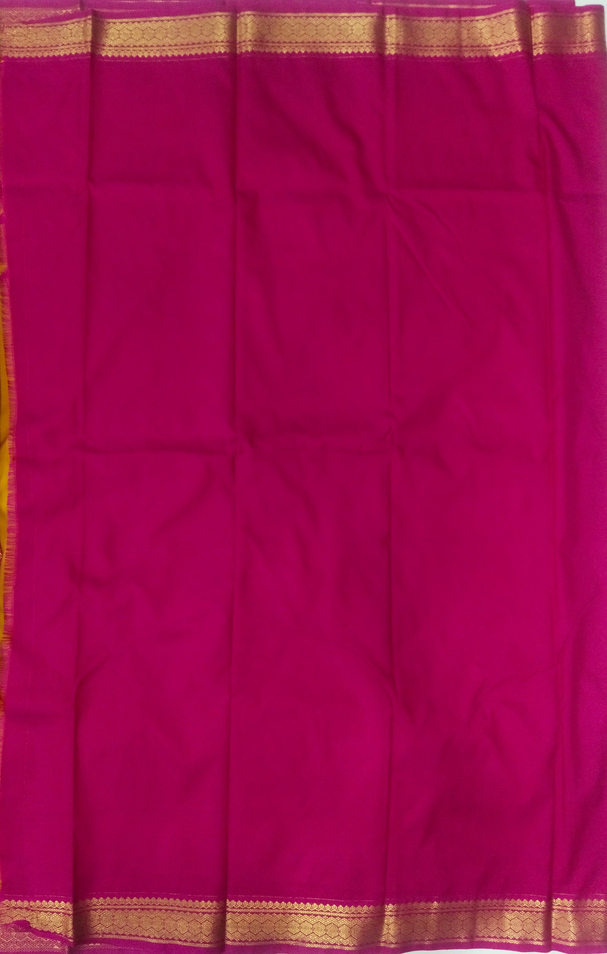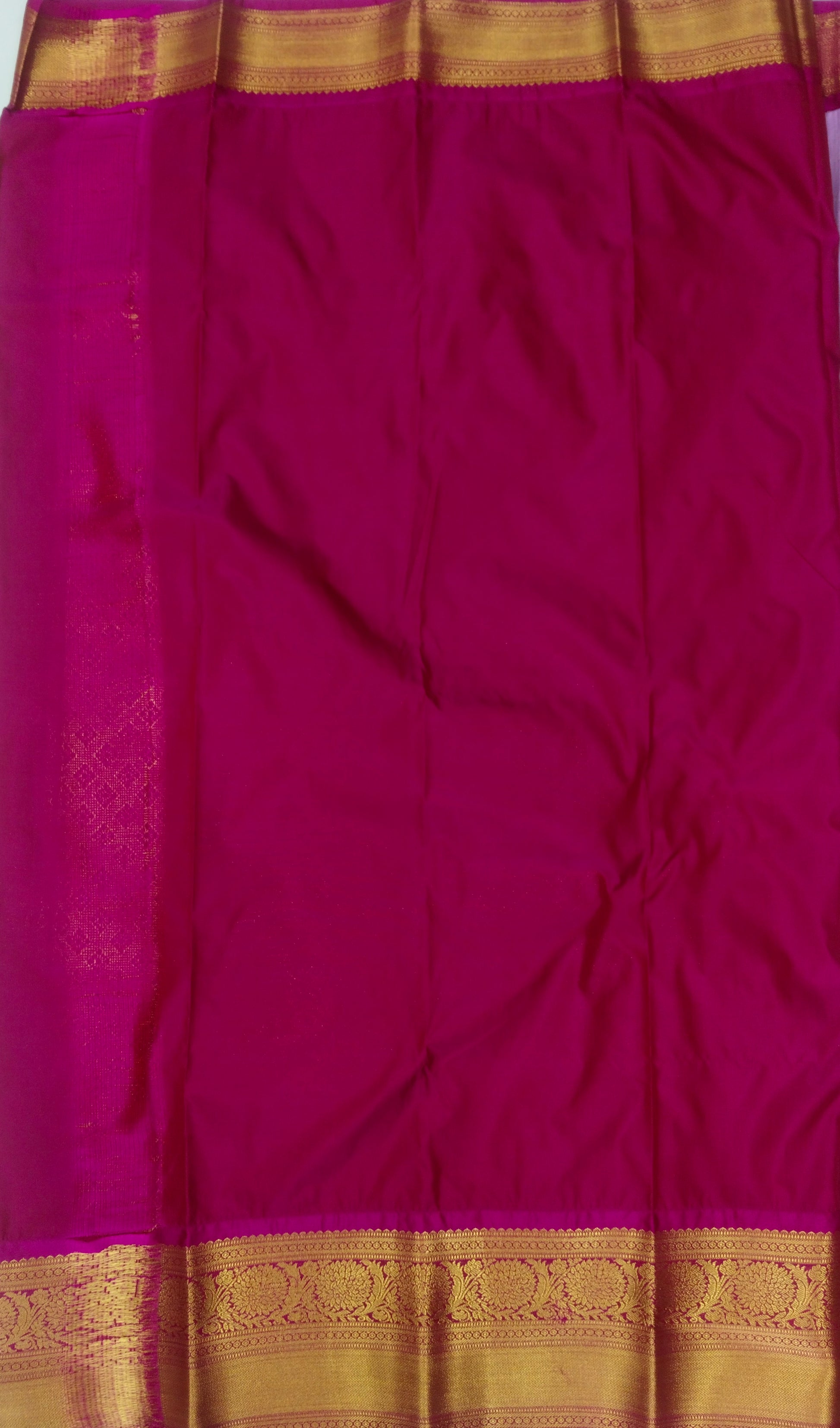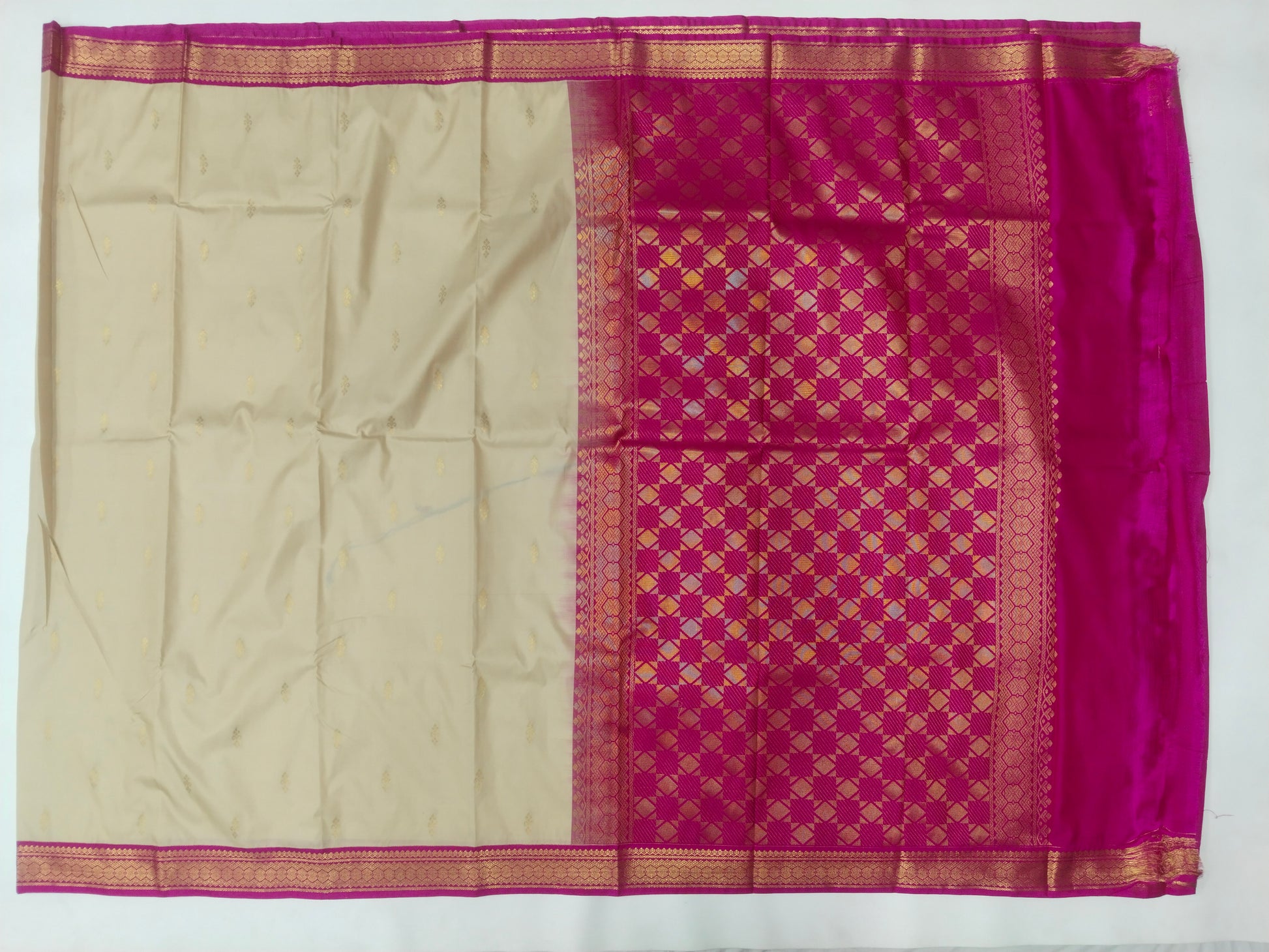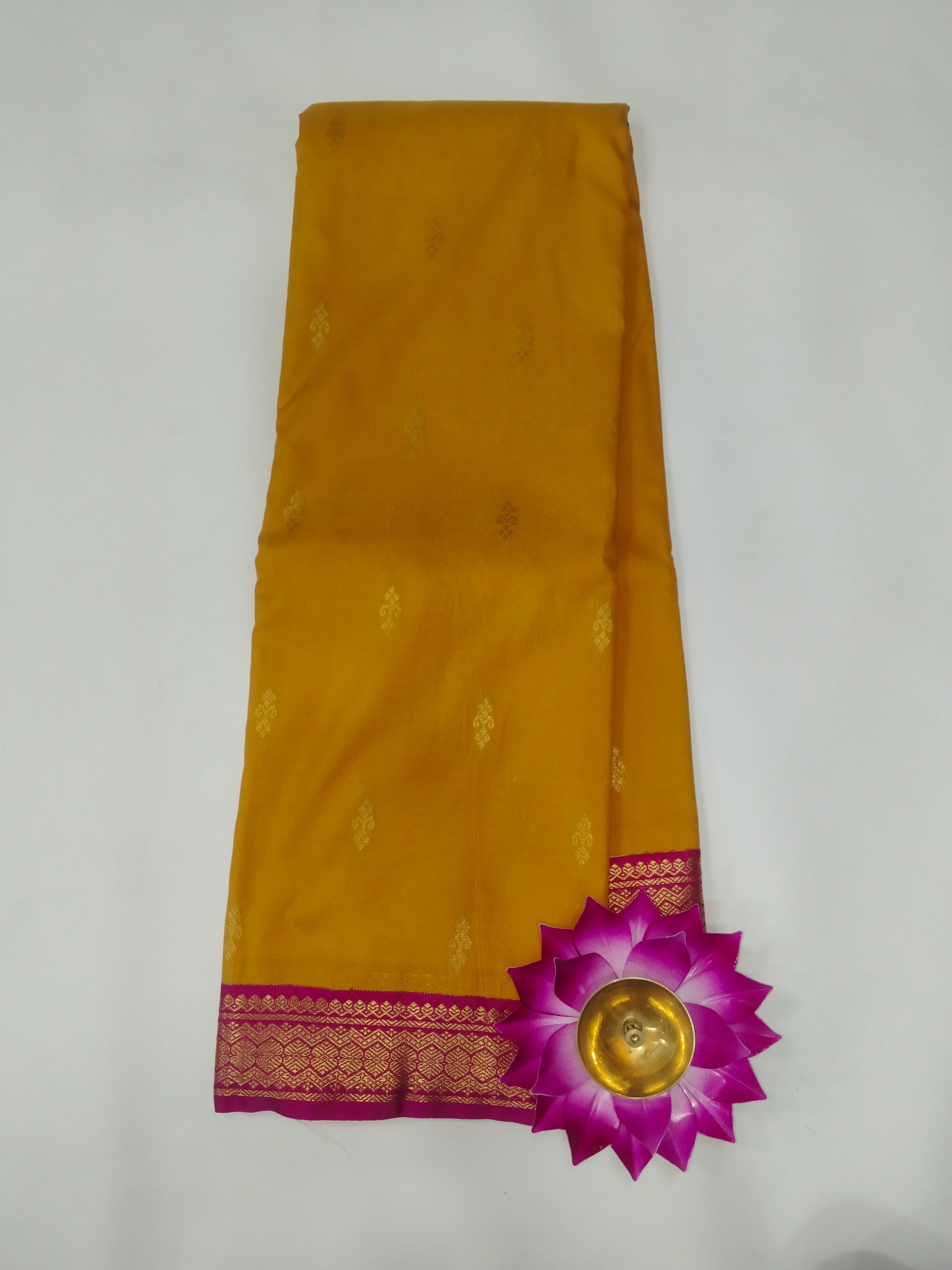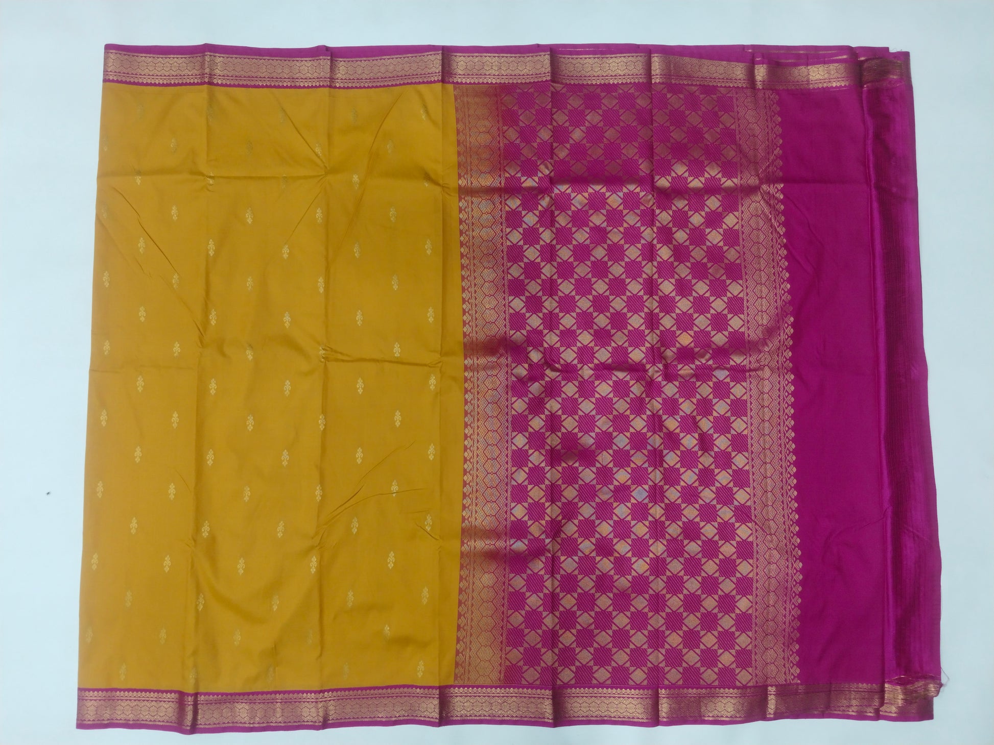 Grace your festive occasions with this charming Semi Kanchipuram Silk Saree, featuring delicate small buta motifs, a rich gold zari border, and a contrasting blouse for a complete traditional look.