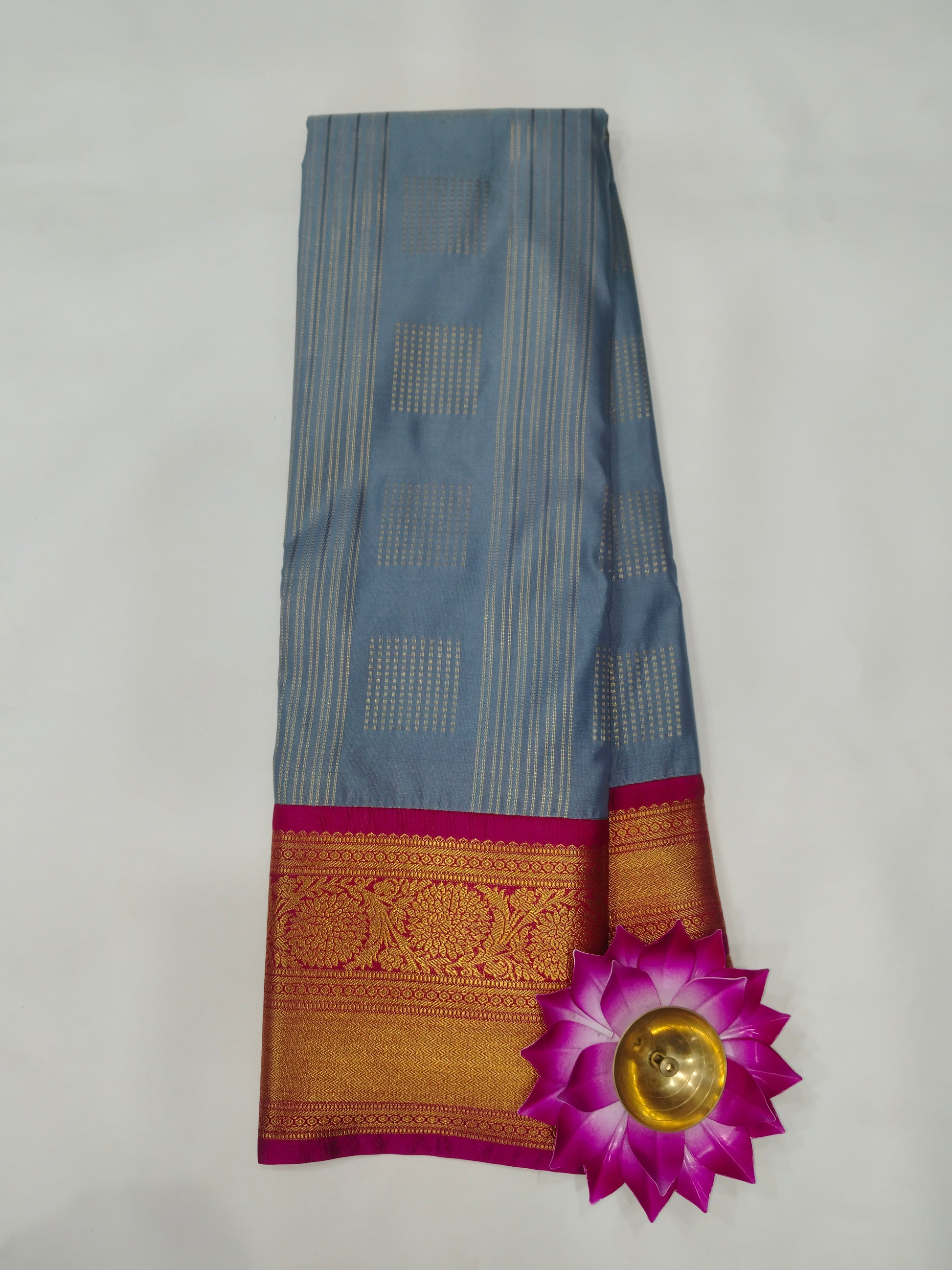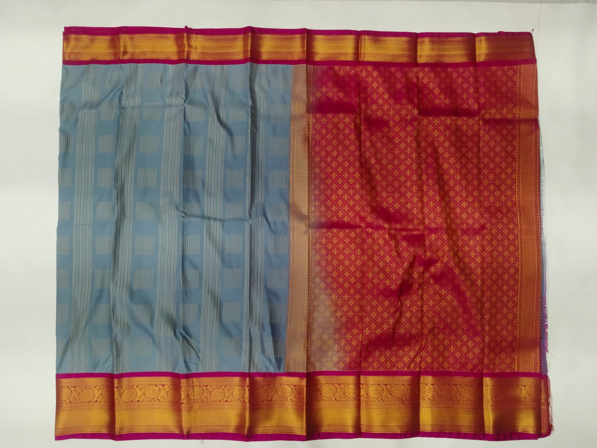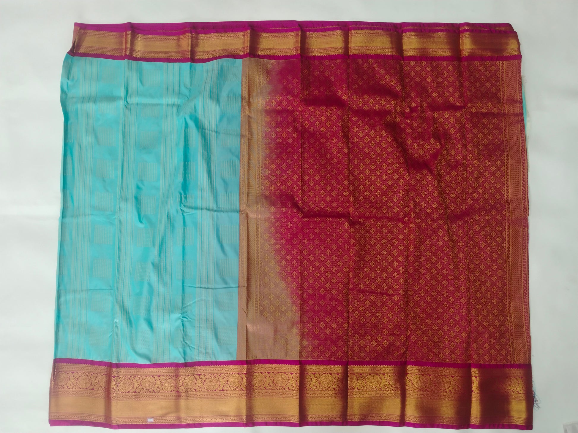 Semi Kanchipuram Silk Saree with square buta with lines and contrast blouse and border with gold zari and rich pallu-veena silk