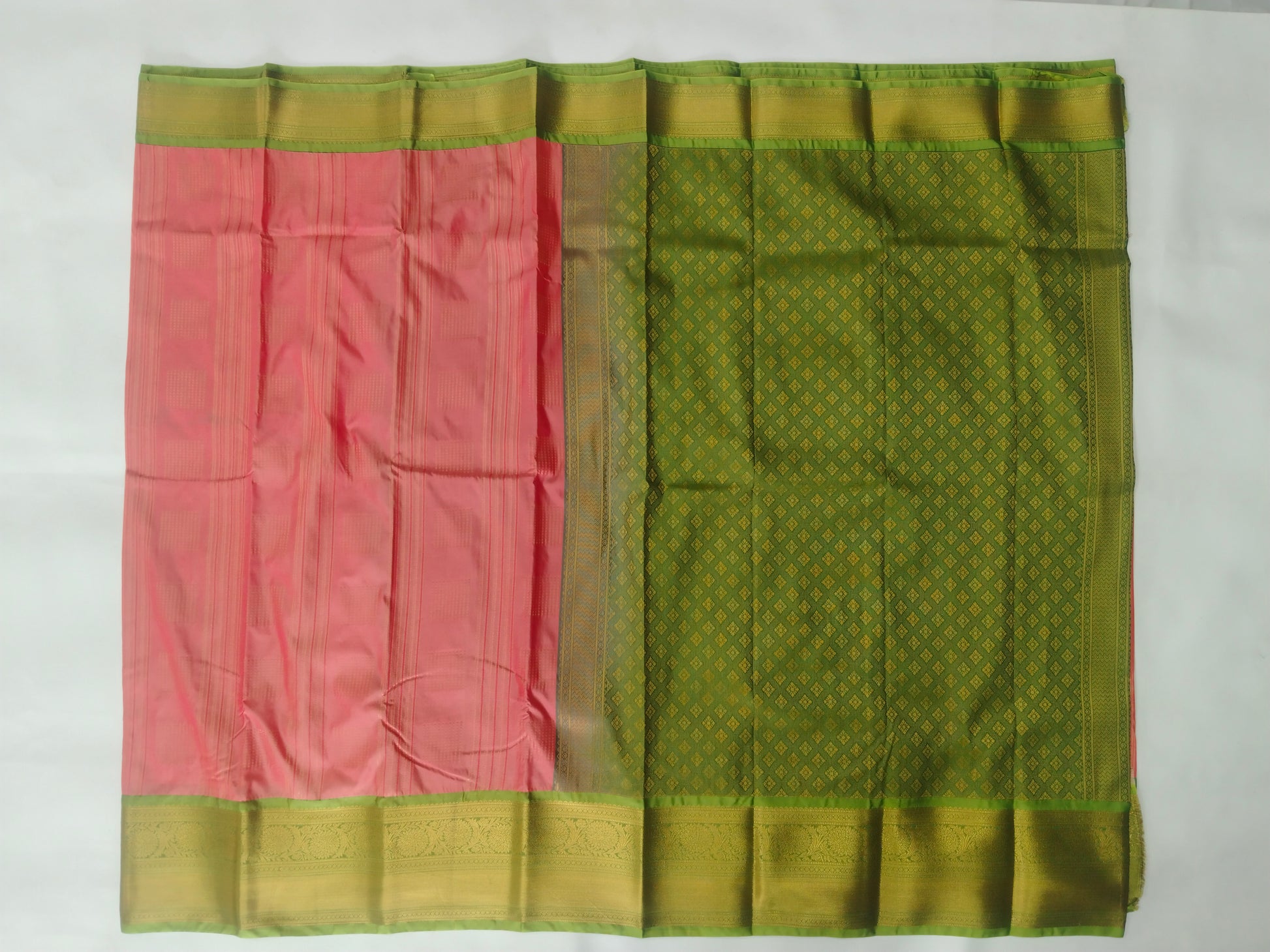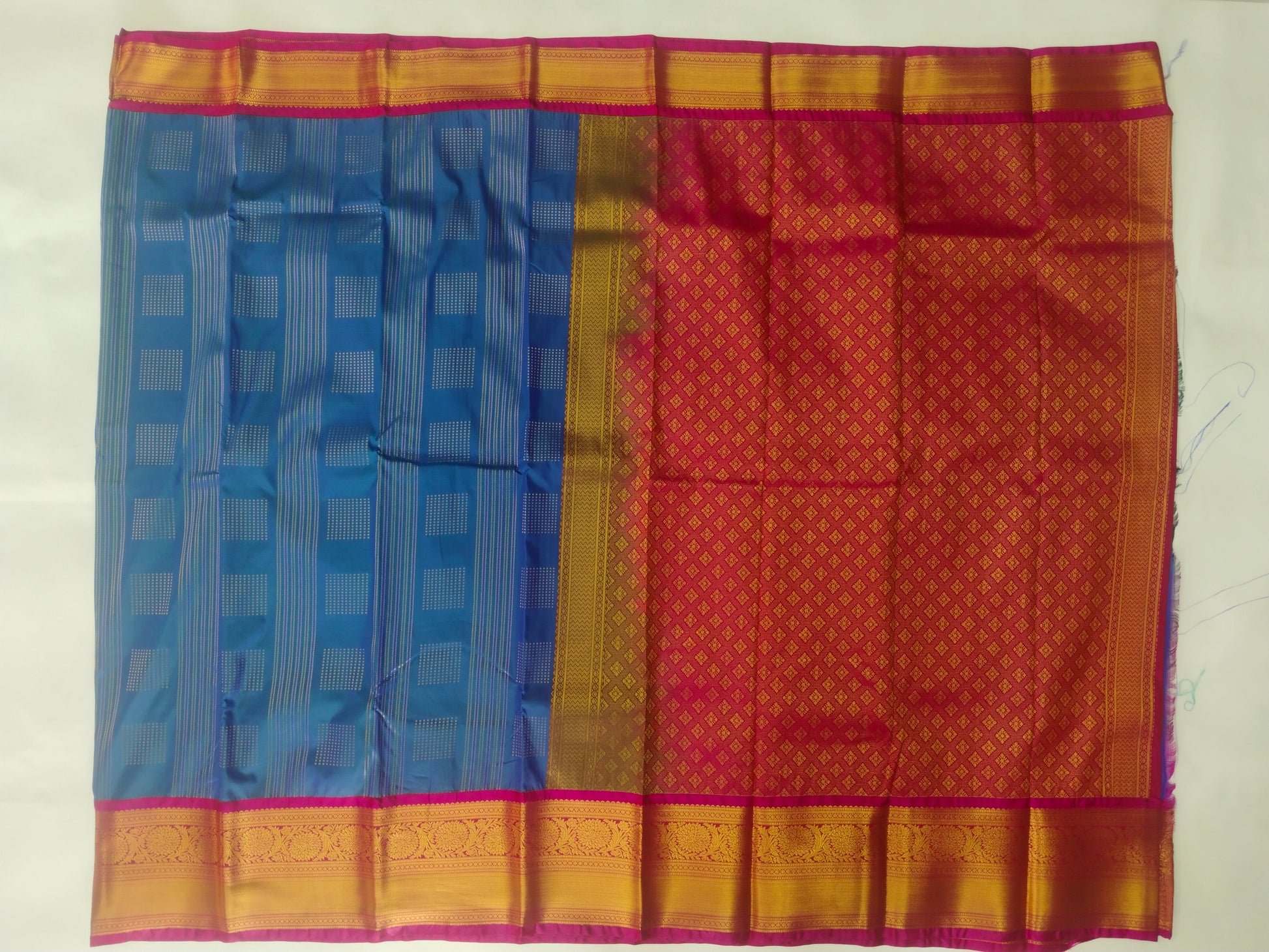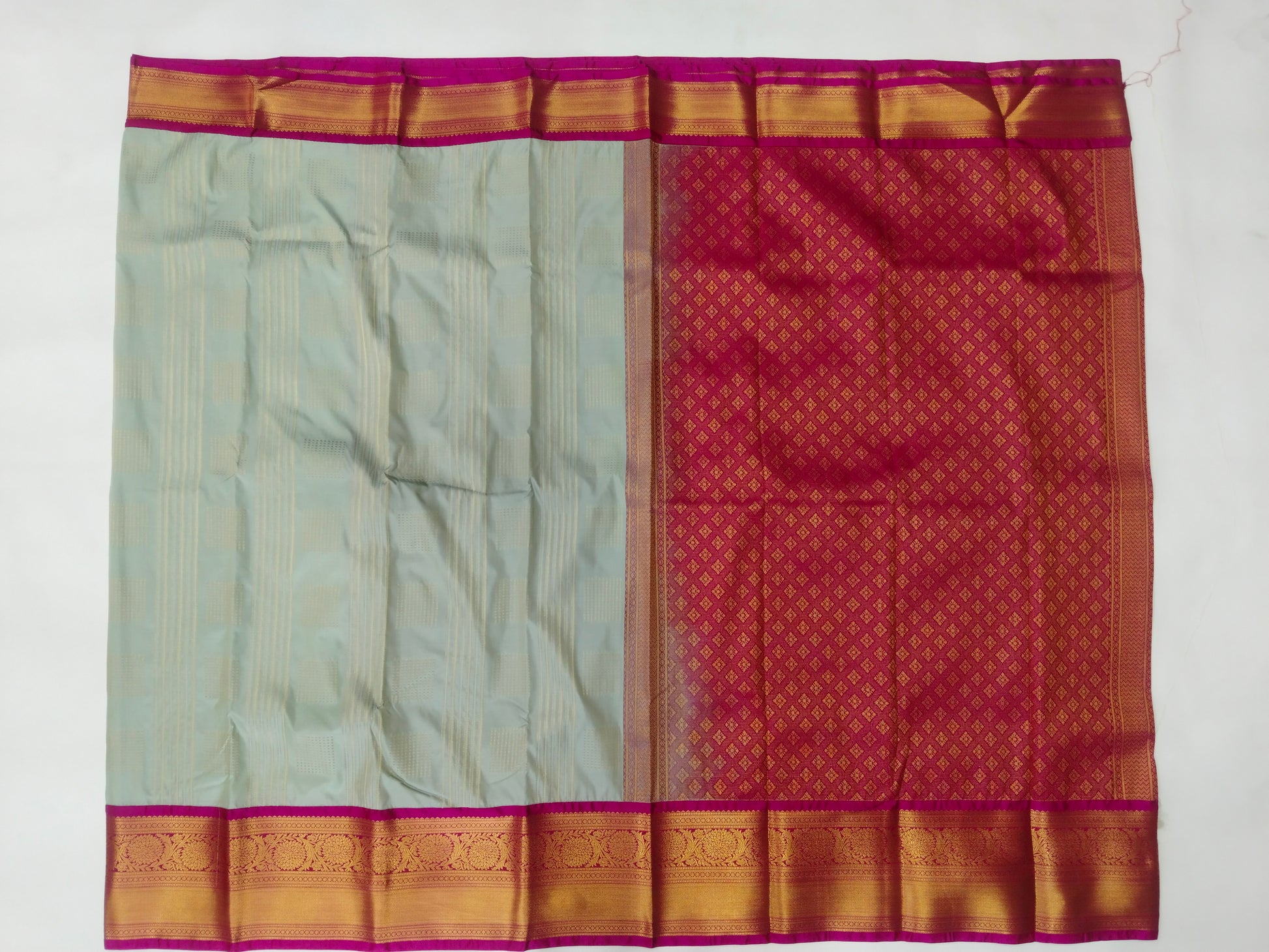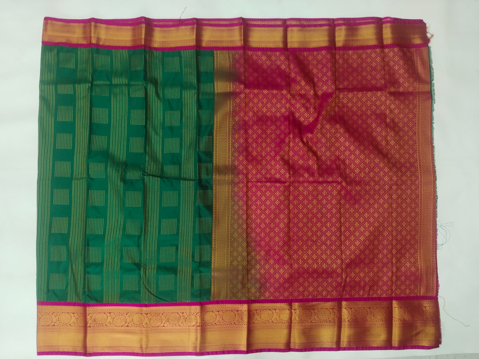 Semi Kanchipuram Silk Saree with square buta with lines and contrast blouse and border with gold zari and rich pallu-veena silk