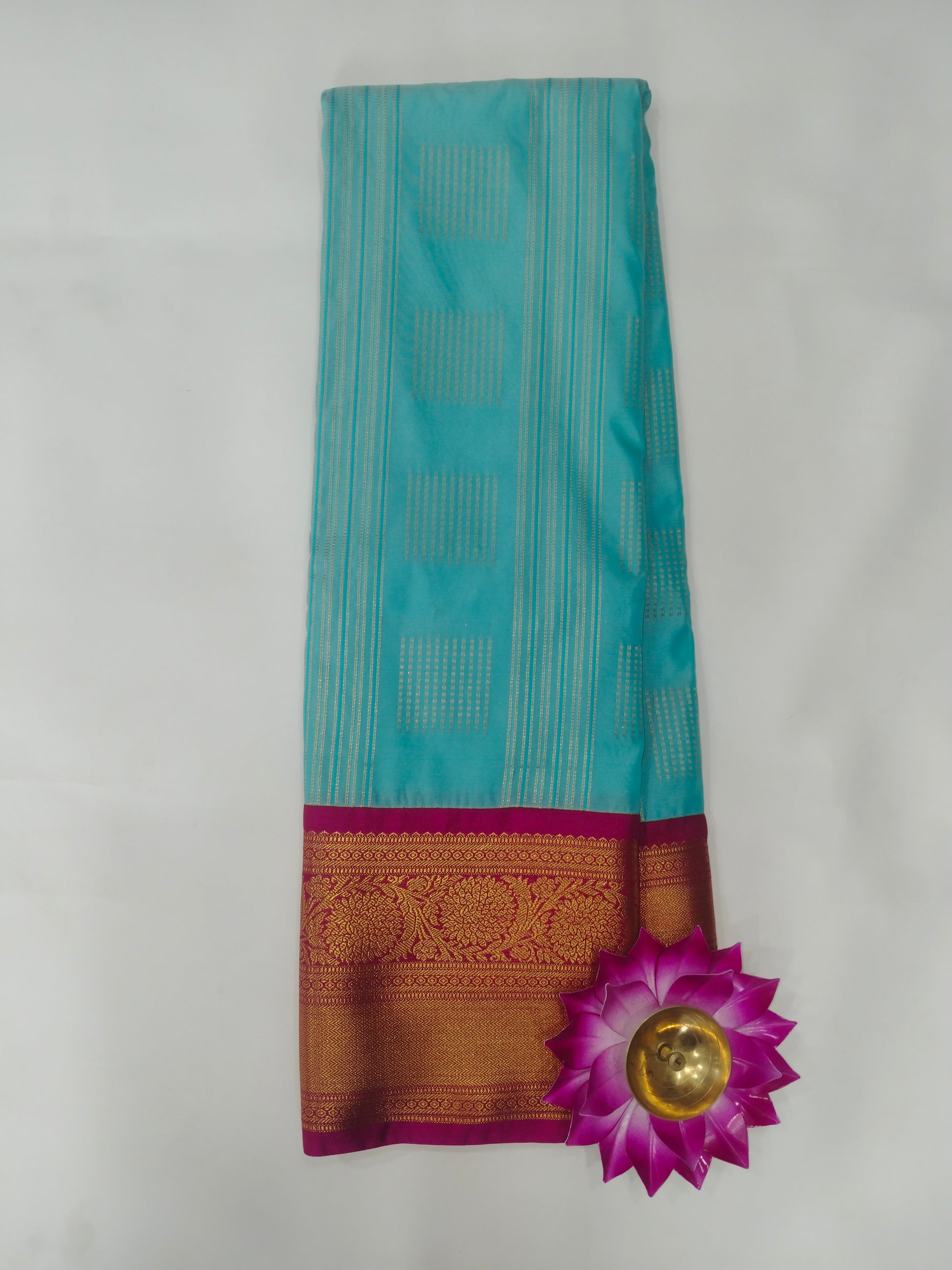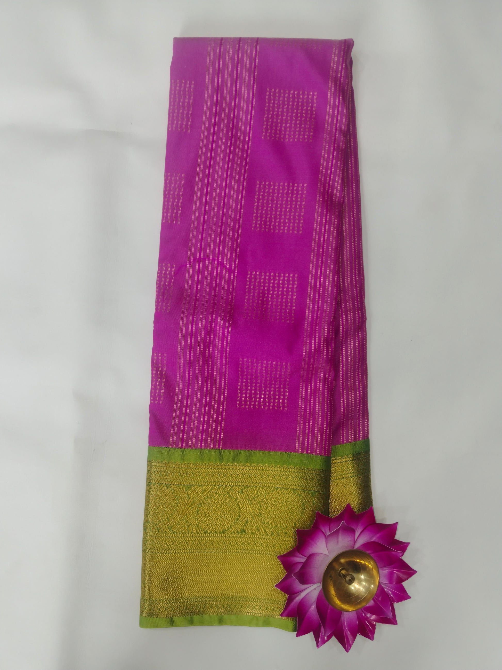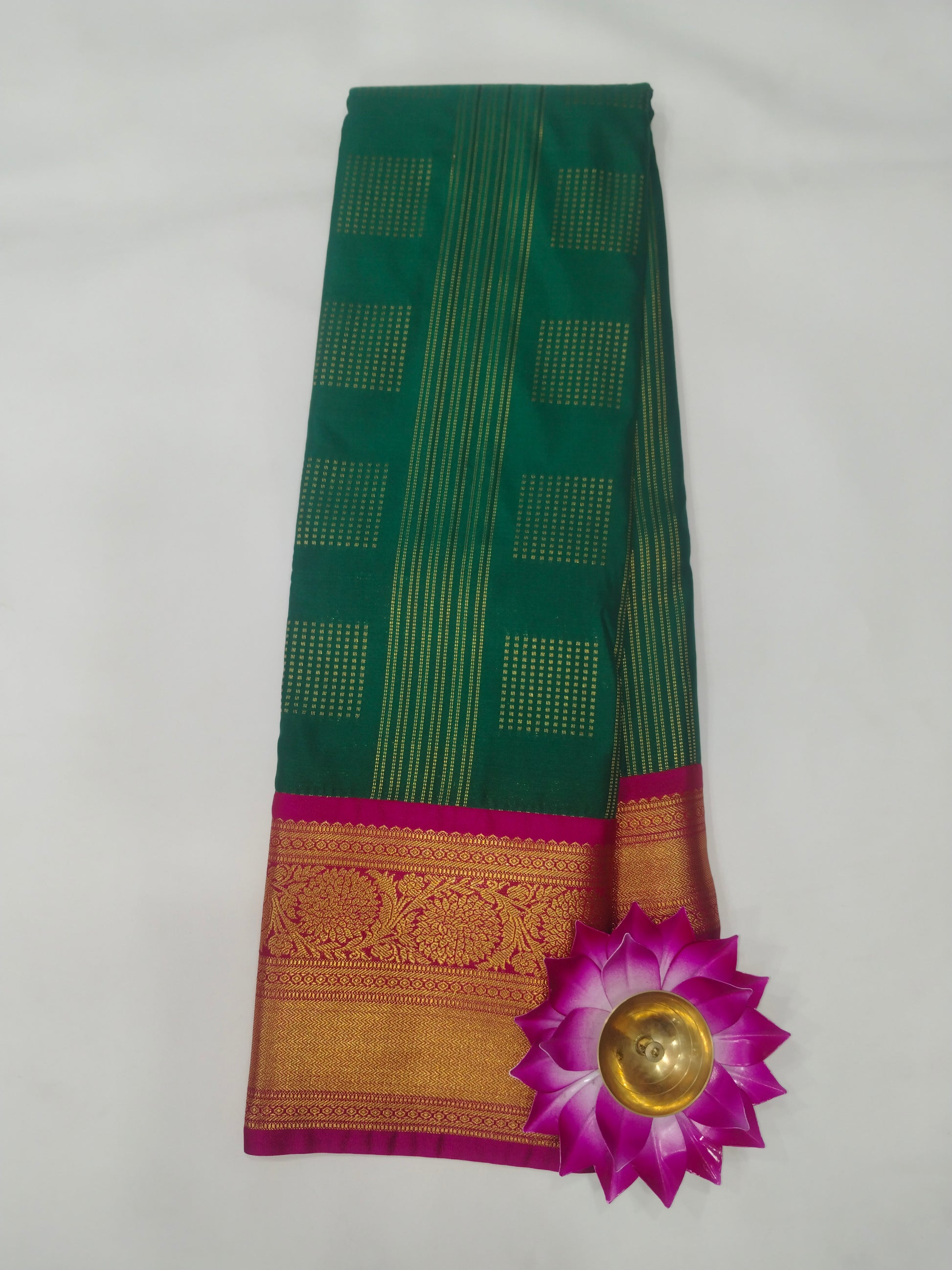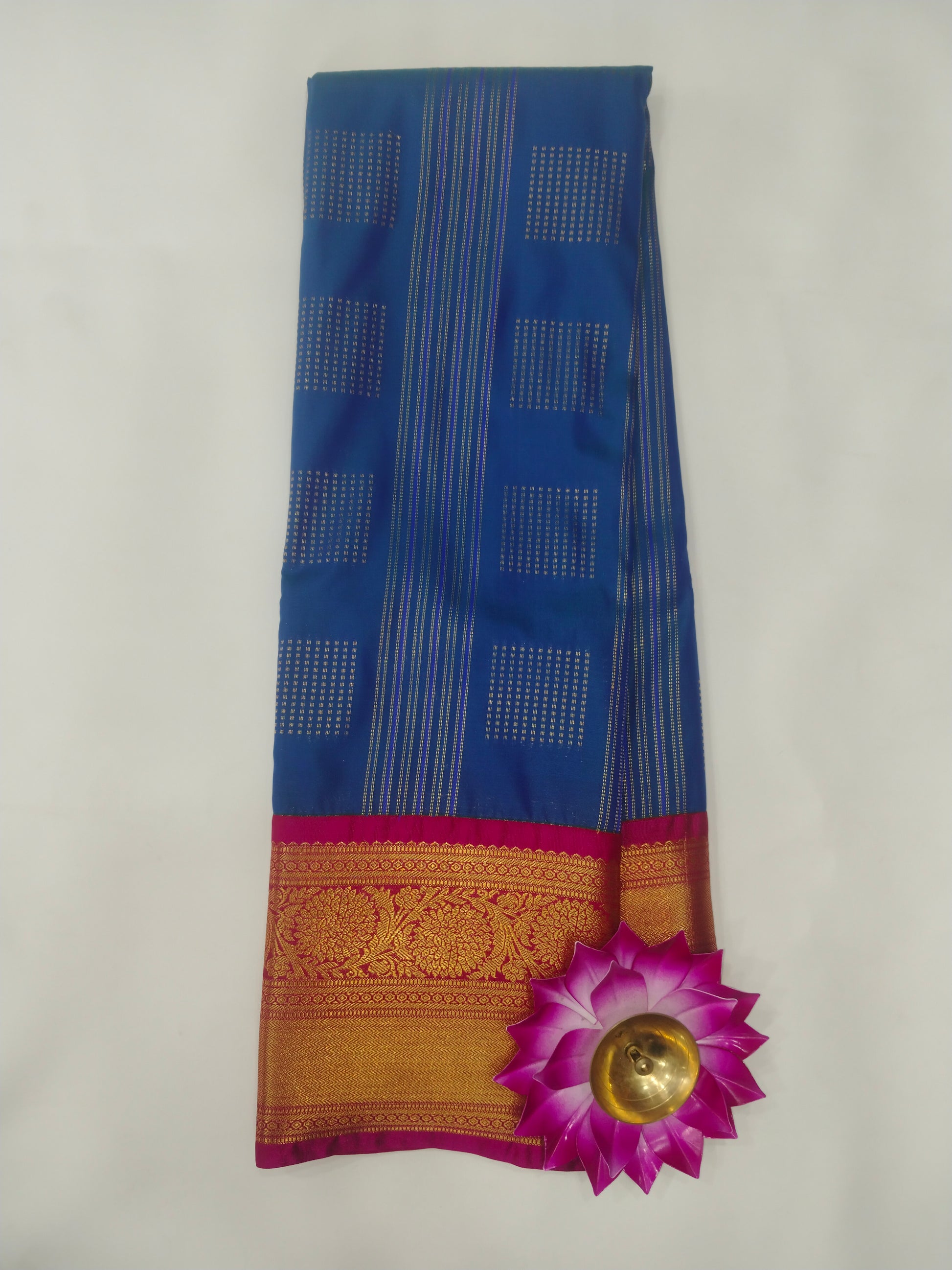 Drape yourself in tradition with this elegant Semi Kanchipuram Silk Saree, featuring square buta motifs with line detailing, a rich contrast blouse, and a gold zari border with grand pallu — perfect for festive occasions.