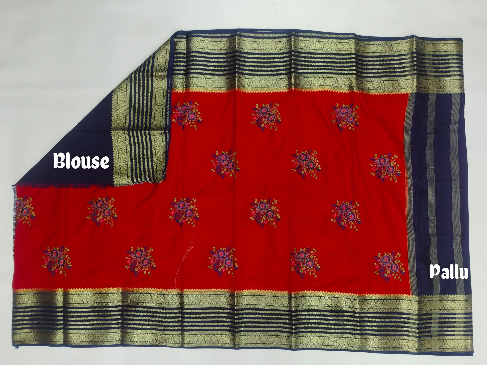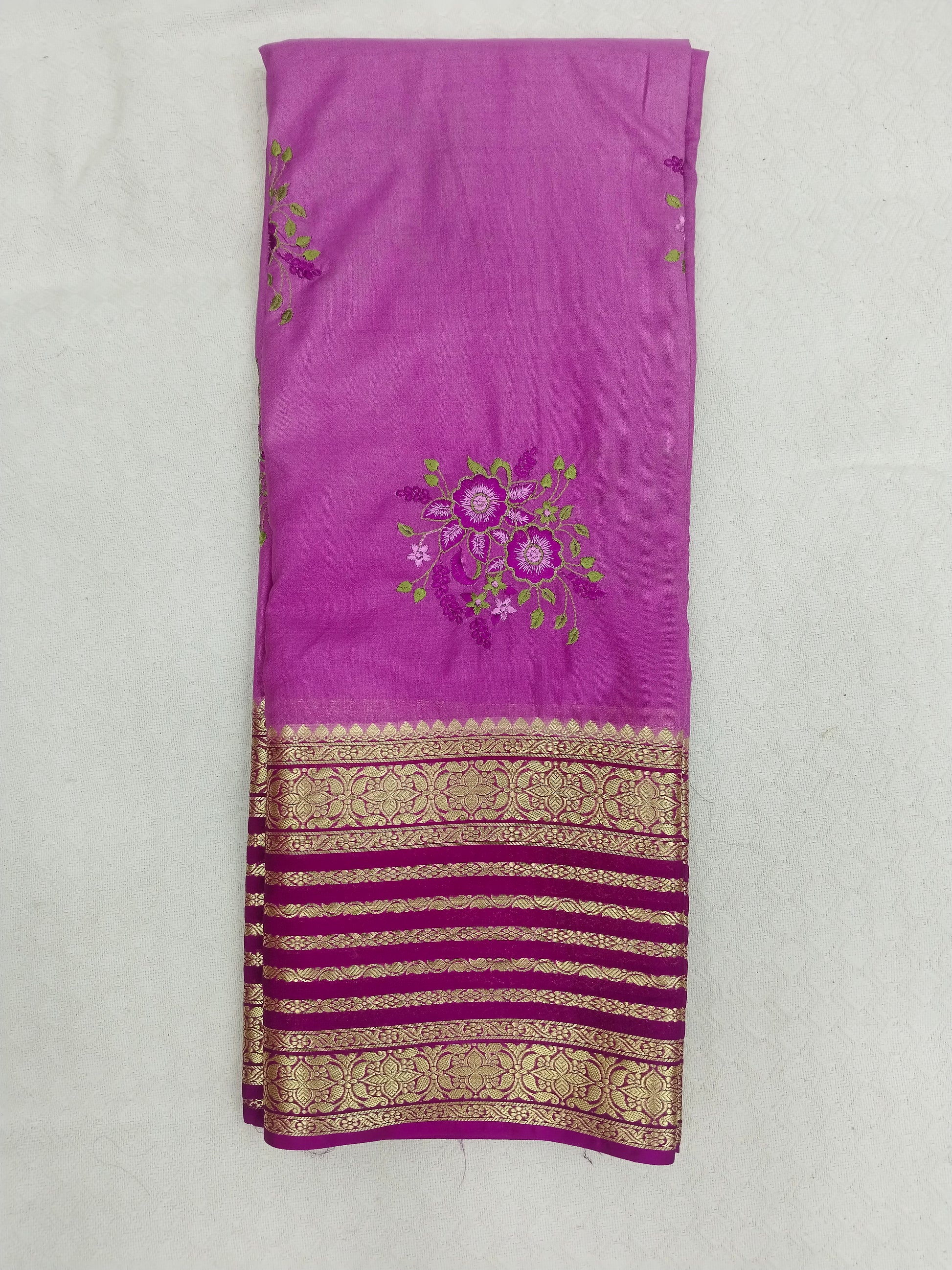 Grace your festive occasions with this elegant Semi Mysore Silk Crepe Saree, beautifully designed with detailed embroidery motifs and a shimmering zari border. A perfect blend of tradition and charm for today’s modern woman.